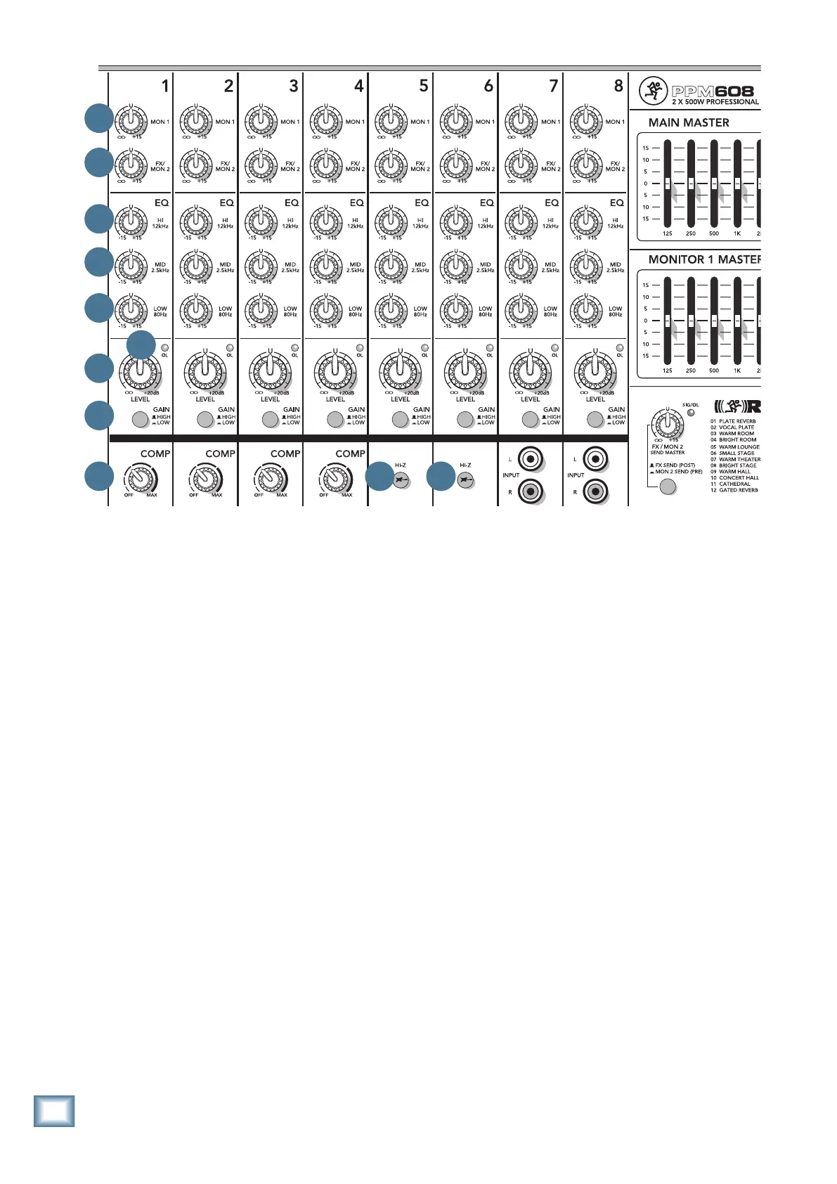 The eight vertical channel strips look very similar,