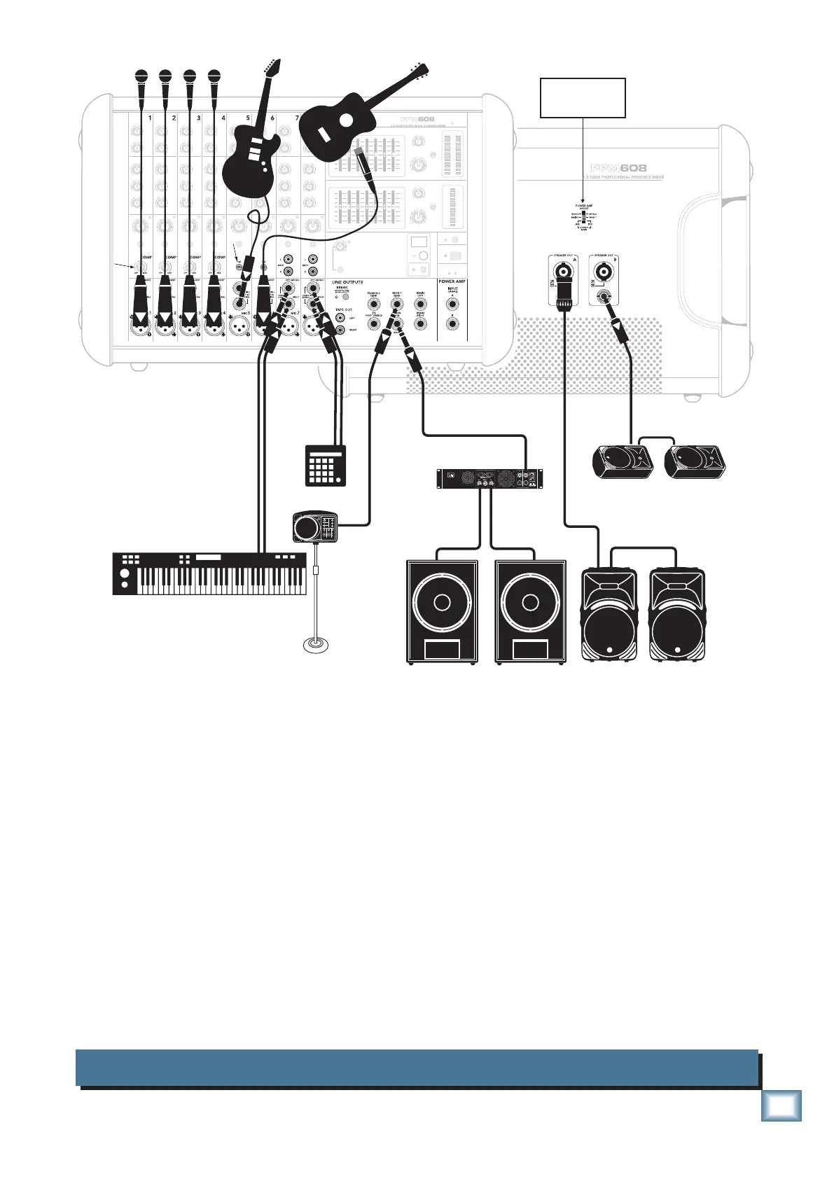 This diagram shows microphones attached to the mic inputs of channels 1 to 4, an electric guitar
