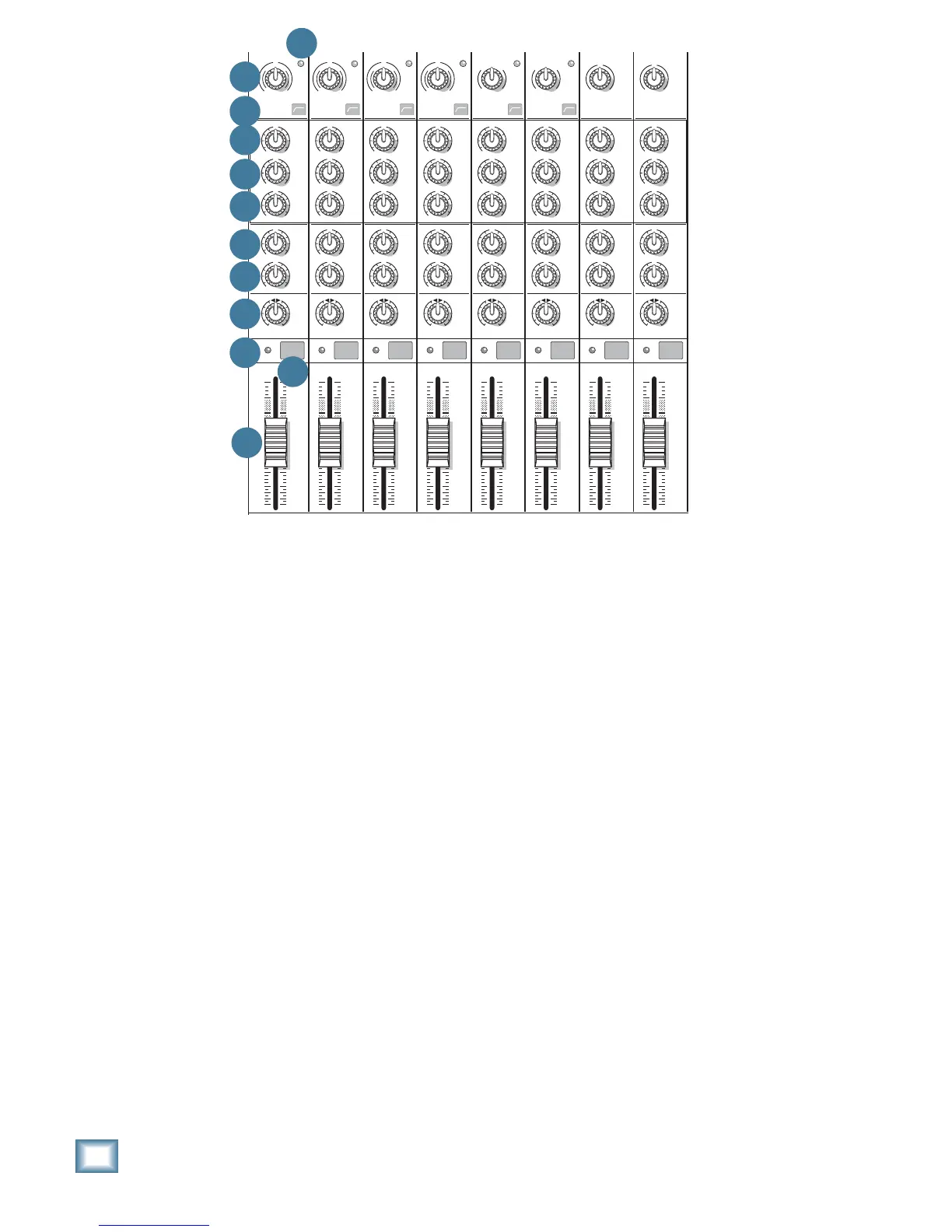 These faders control the channel’s level, from off, to