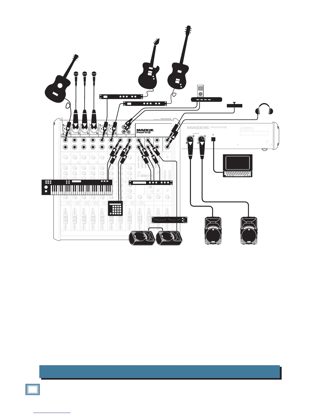 phones attached to channels 2, 3, and 4, guitar effects processors connected to the left line-level input of