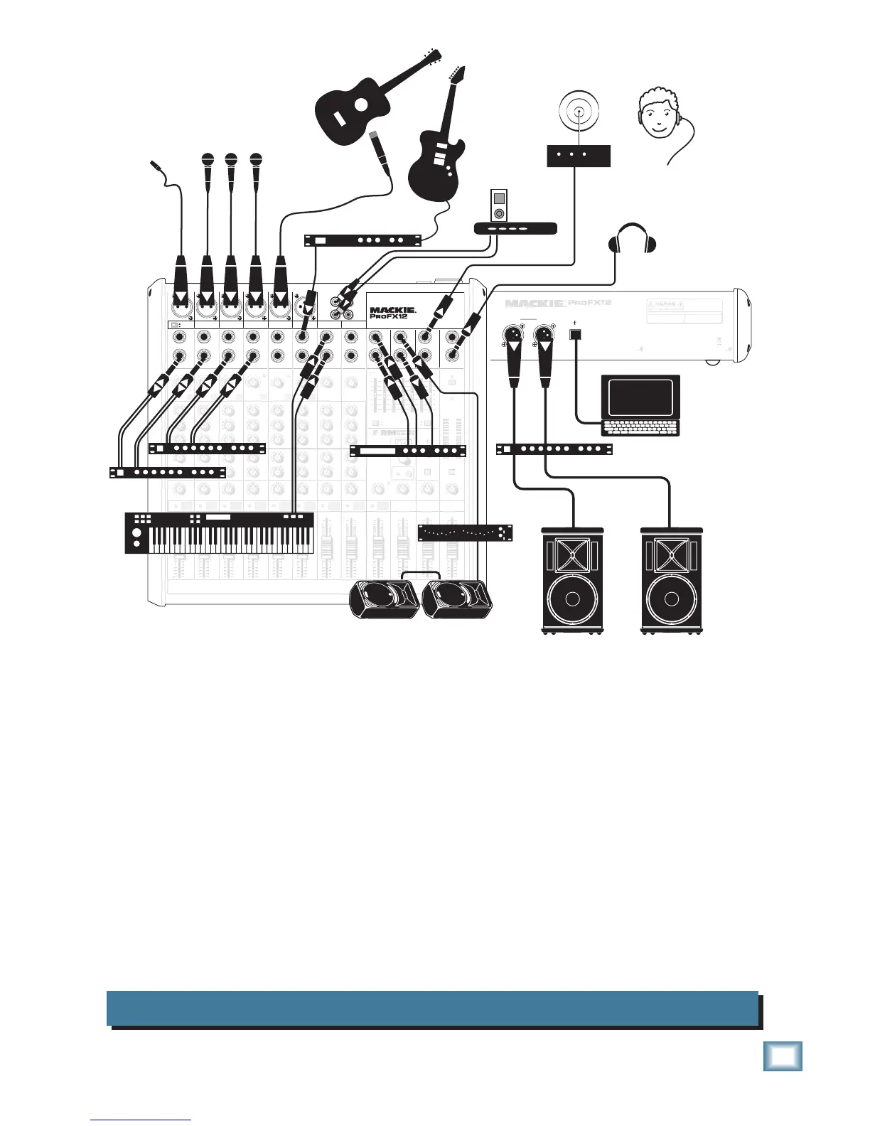 This diagram shows various microphones attached to channels 1 to 4, a guitar mic on channel 5/6, a