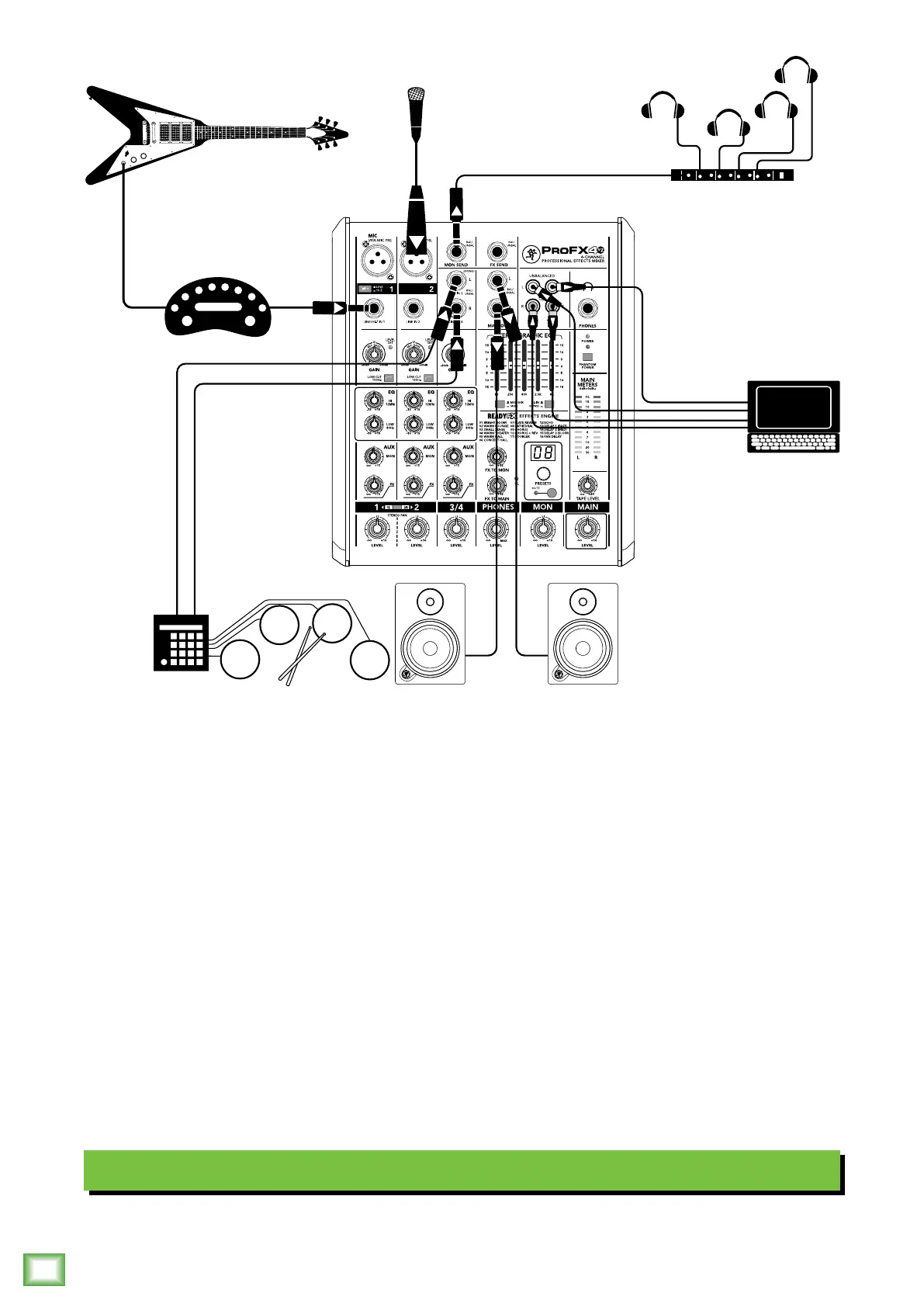 A microphone is connected to the channel 2 XLR input for vocals and a drum machine is attached to the