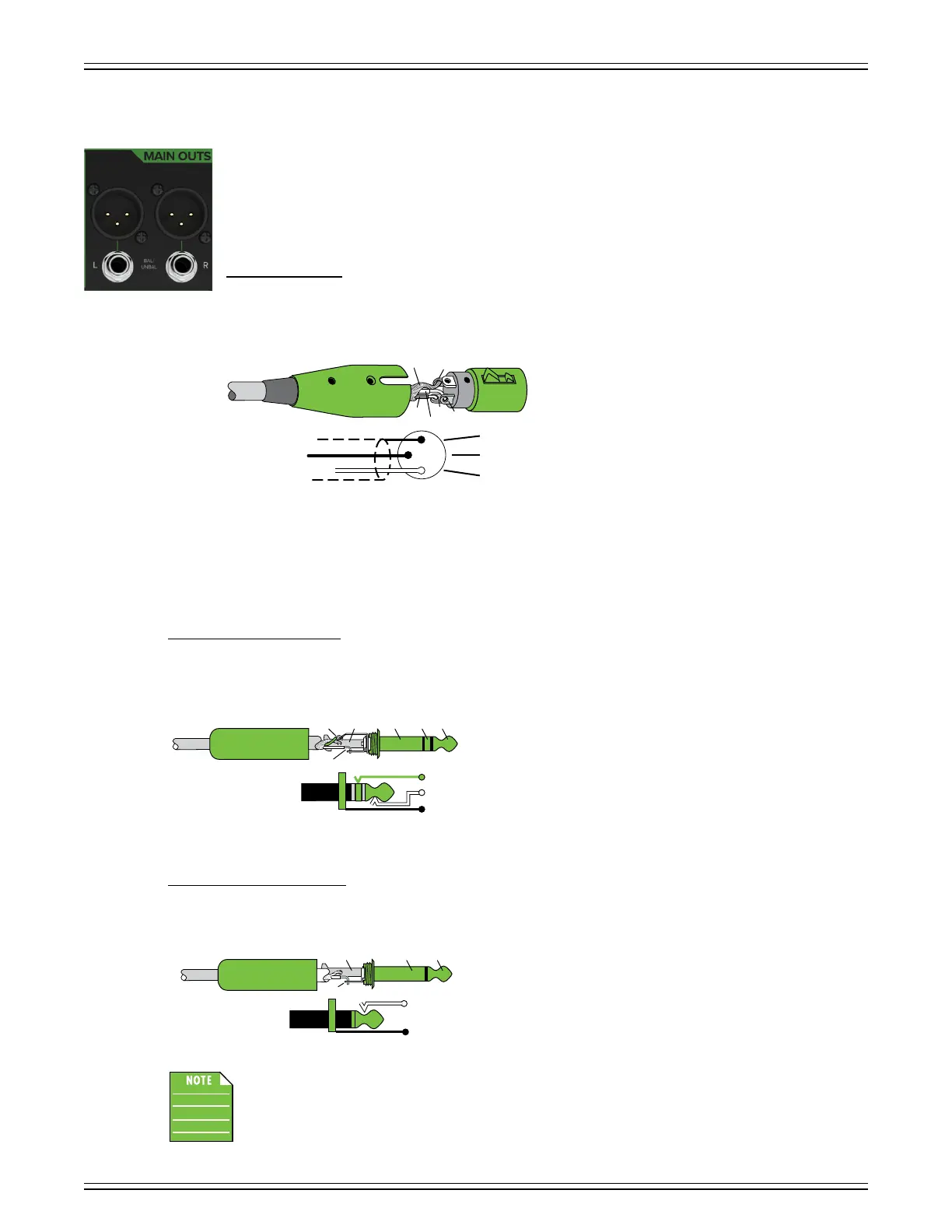 To connect unbalanced lines to these outputs, use a /4" mono (TS) phone plug, wired as follows: