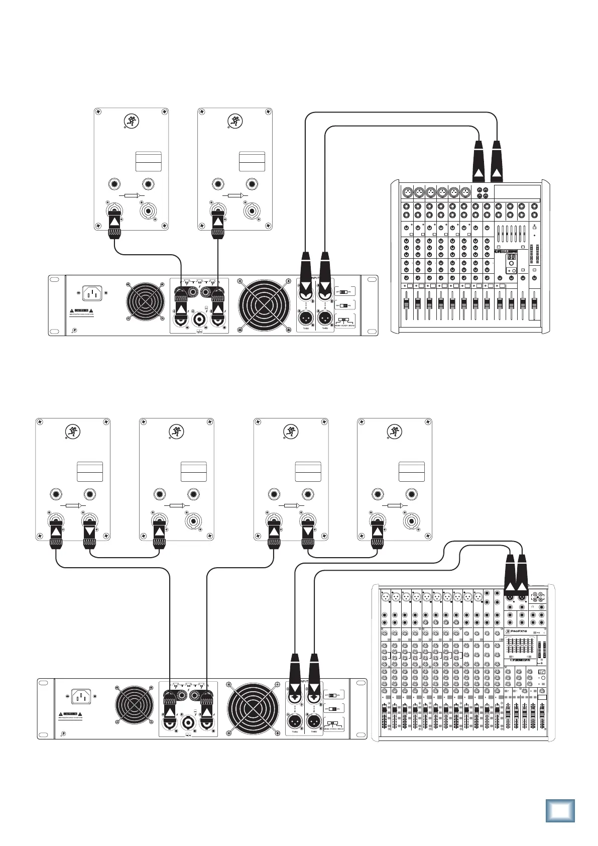of the power amplifier feed the inputs of two Mackie S515 loudspeakers. Their respective THRU jacks