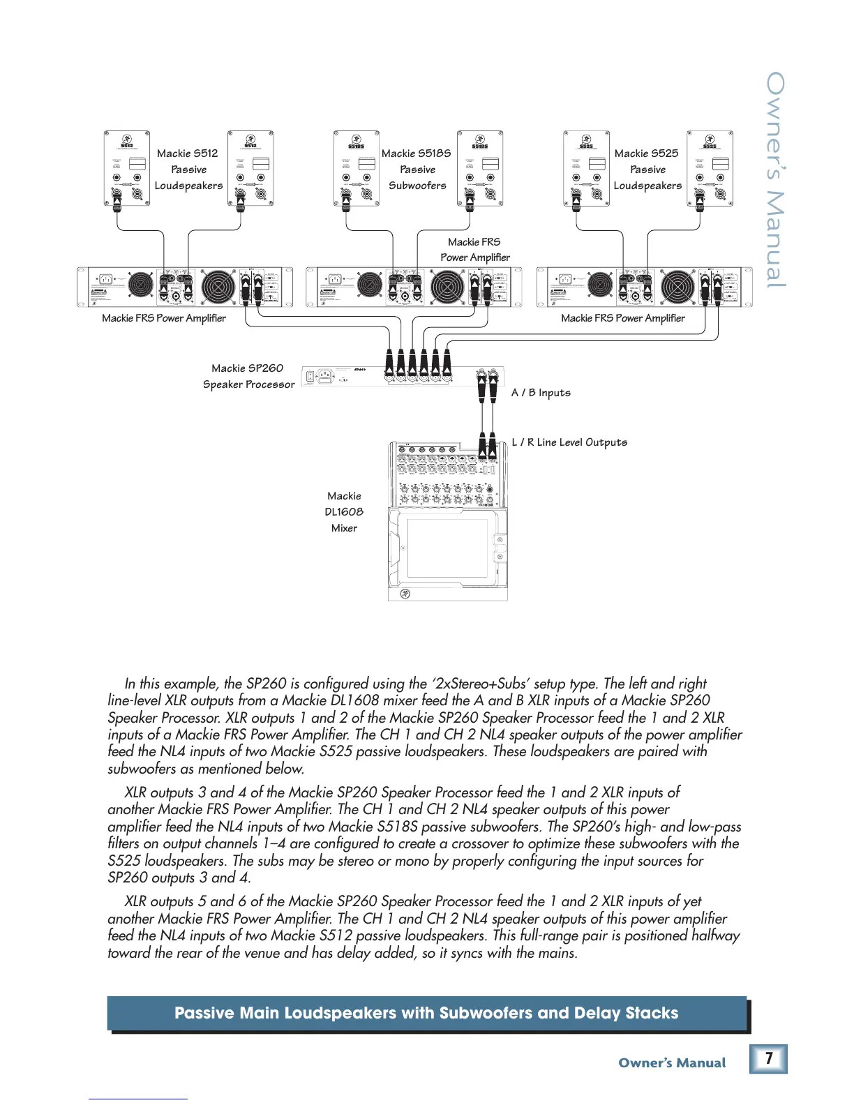 Speaker Processor. XLR outputs 1 and 2 of the Mackie SP260 Speaker Processor feed the 1 and 2 XLR