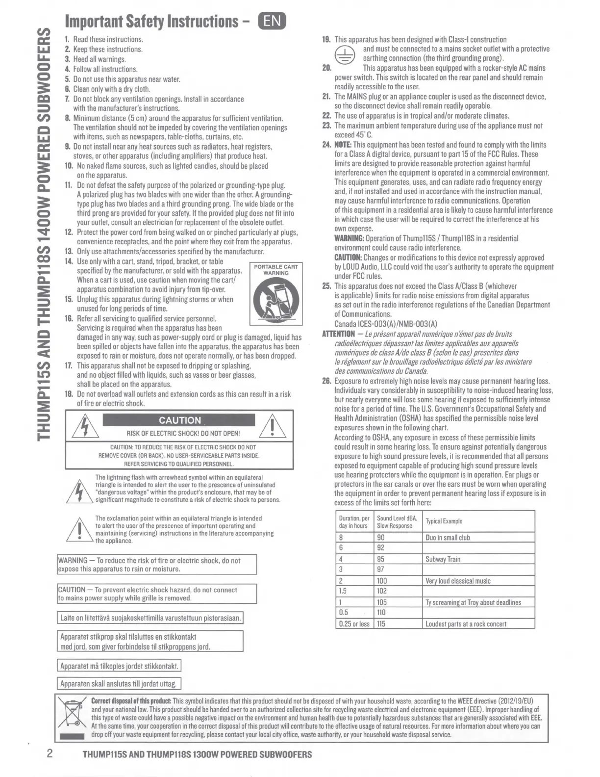 Mackie Thump 115S - Important Safety Instructions; Electrical Safety Precautions; Hearing Safety and Noise Exposure Limits; Proper Product Disposal Guidelines