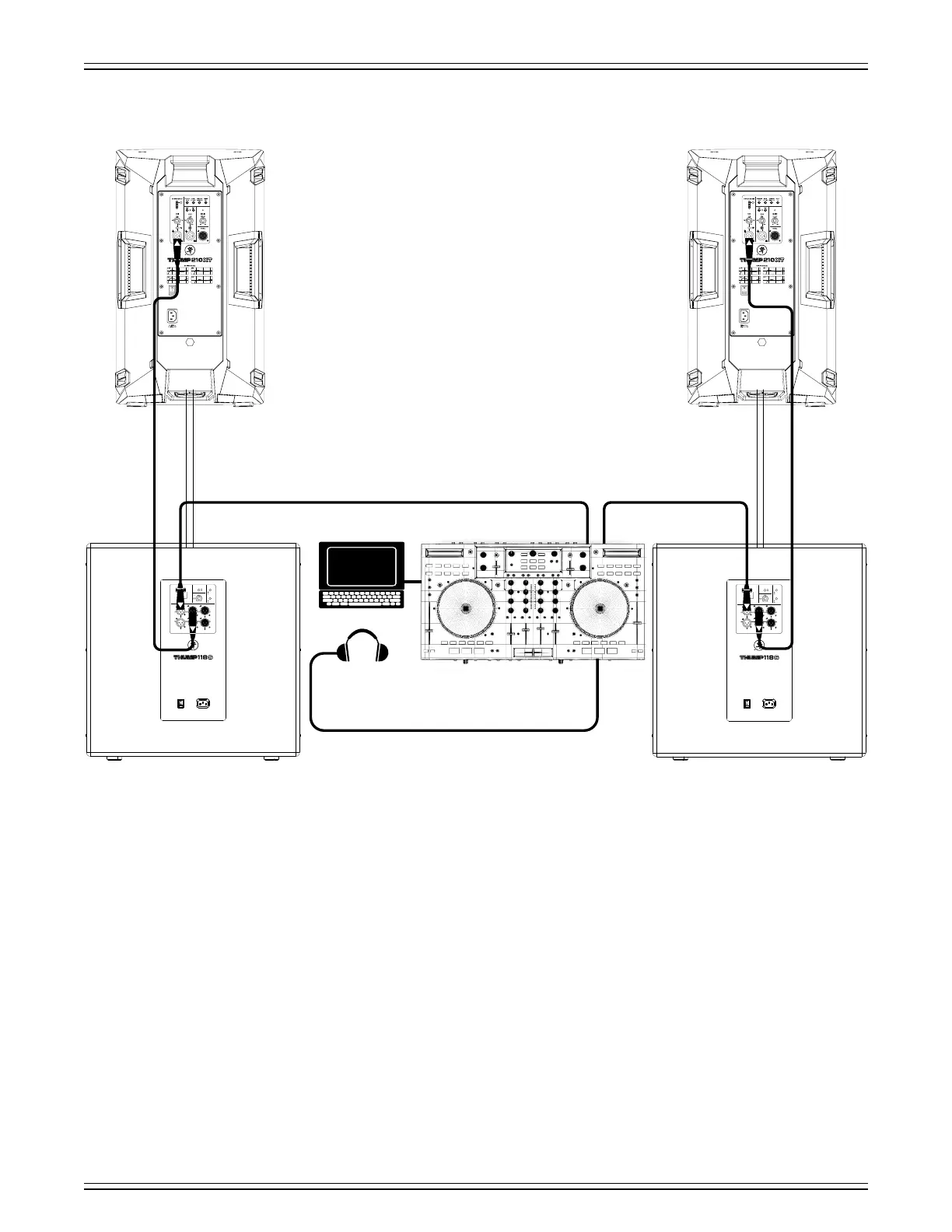 The L/R outputs of the DJ controller are connected to the “A” inputs of two Thump8S subwoofers.