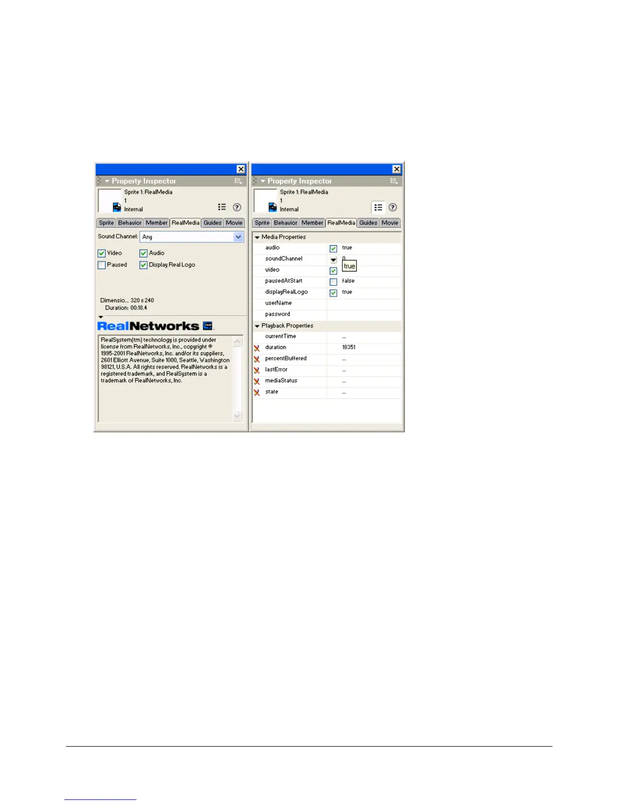 The RealMedia tab in the Property inspector displays the properties of RealMedia cast members.