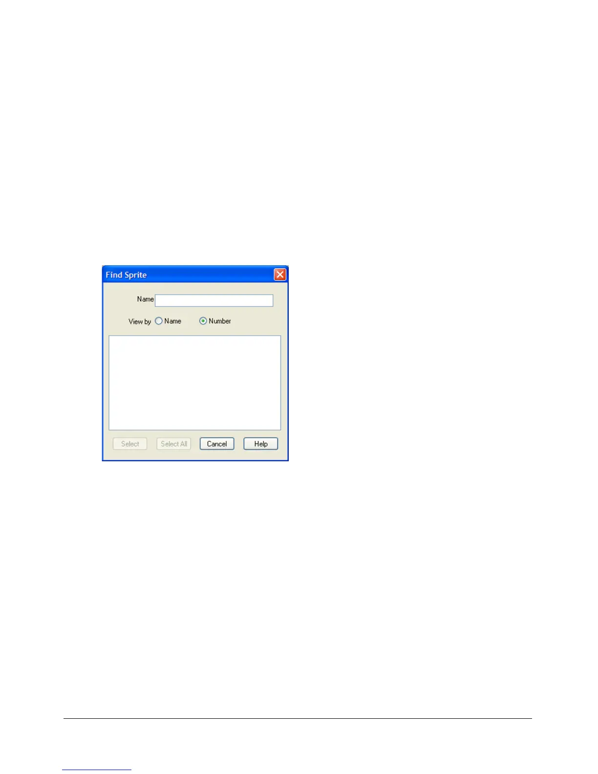 1 Select Edit > Find > Find Sprite. The Find Sprite dialog box opens with a list of the named