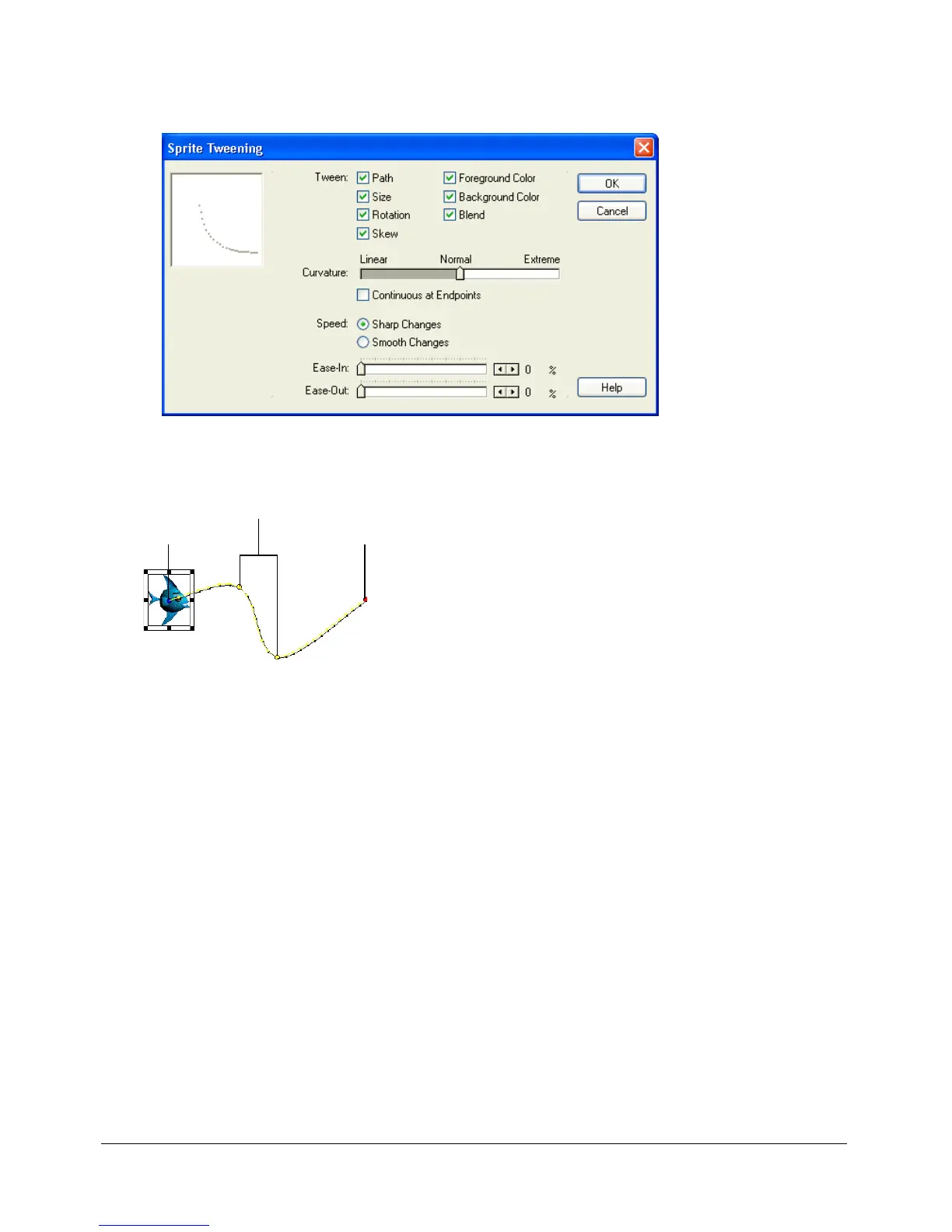 You can tween a sprite directly on the Stage by editing the sprite’s path. Director displays the
