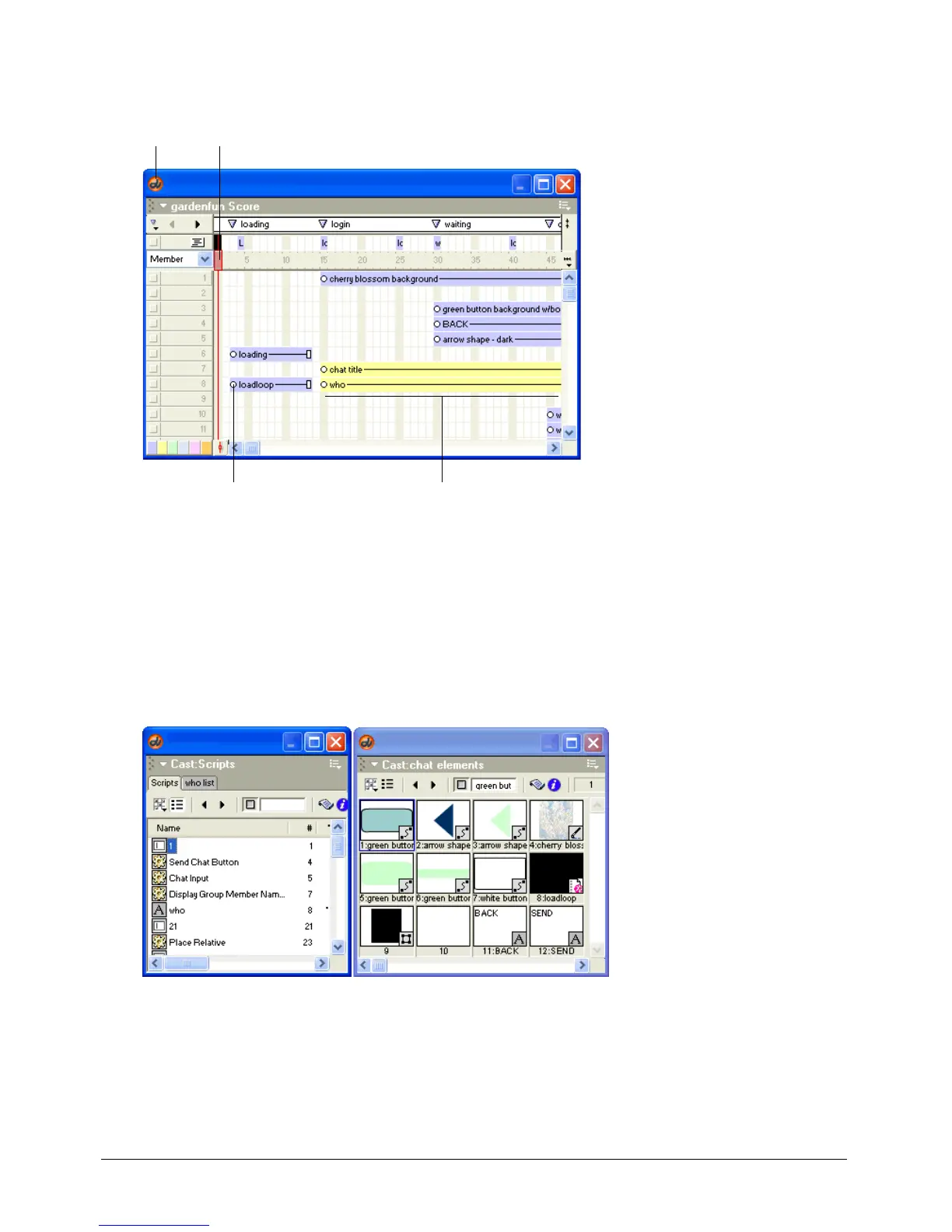 sounds, text, graphics, and other movies. Cast members can also include assets that you use in