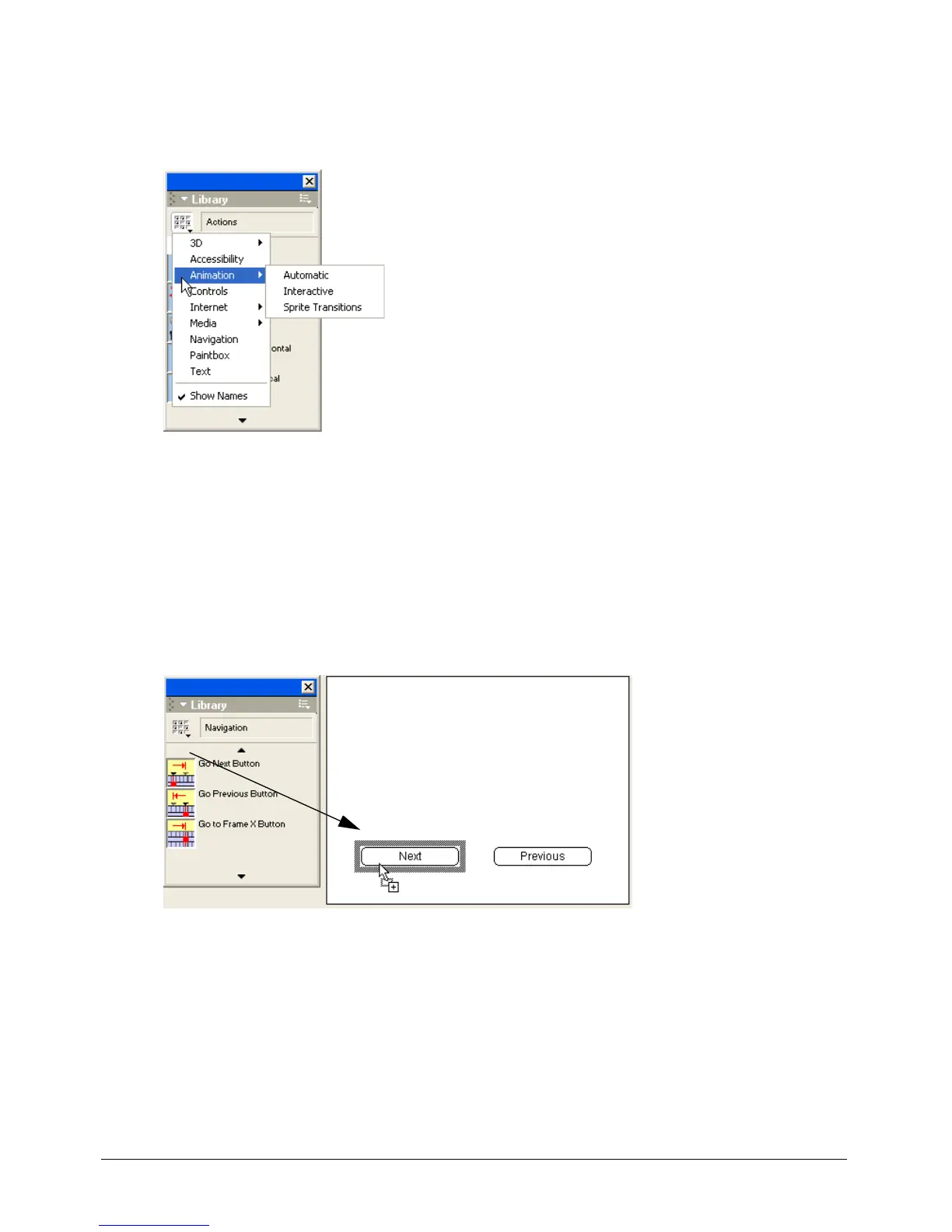 2 Select a library from the Library pop-up menu in the upper left corner of the palette.
