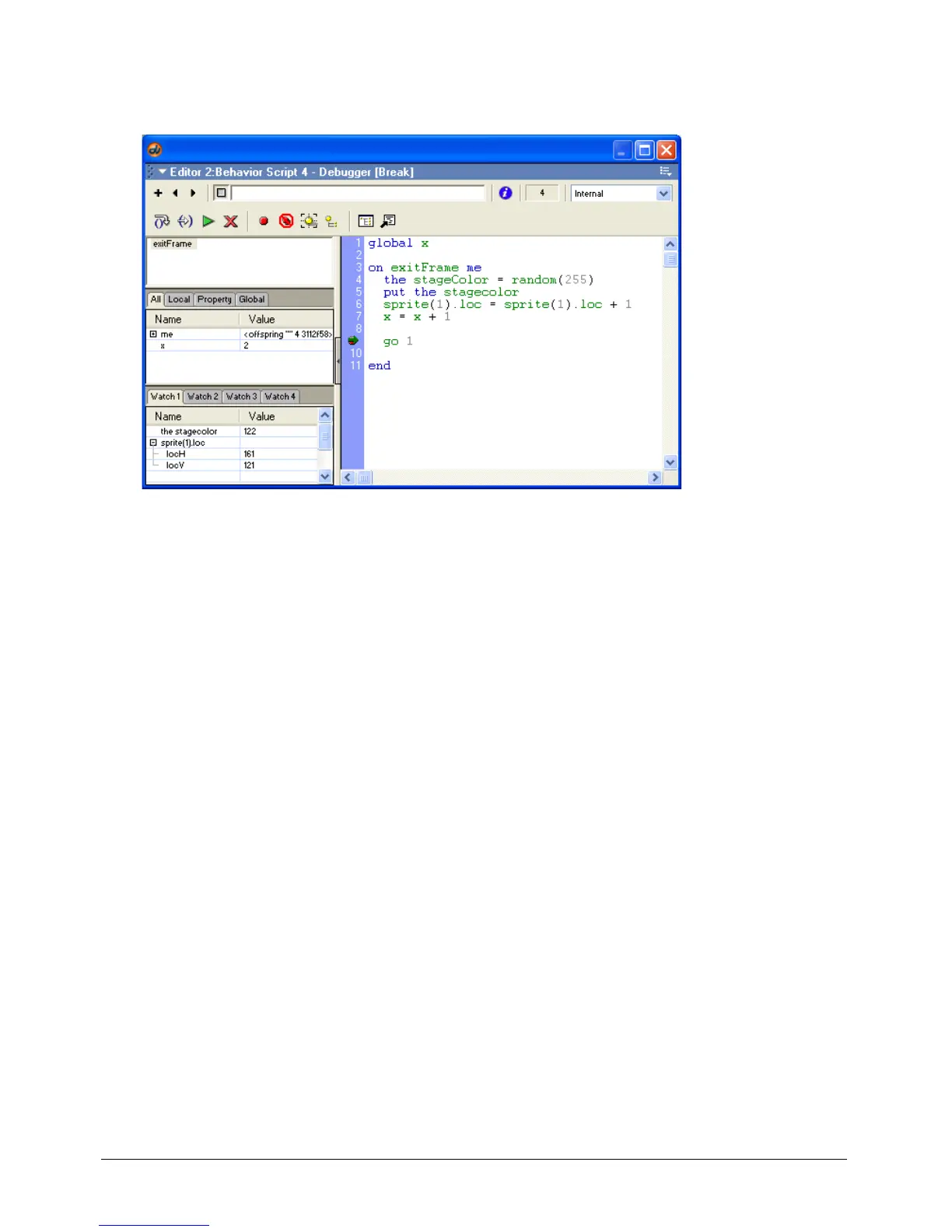 The green arrow points to the current line. You can’t select a different line of Lingo by clicking
