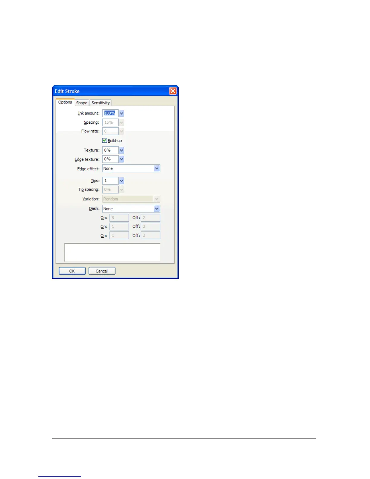 The Edit Stroke dialog box has three tabs: Options, Shape, and Sensitivity.