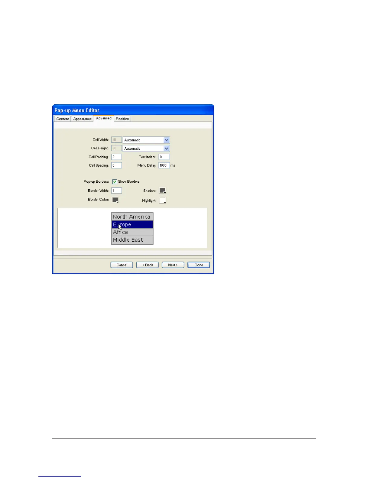 The Advanced tab of the Pop-up Menu Editor offers additional settings to control cell size,