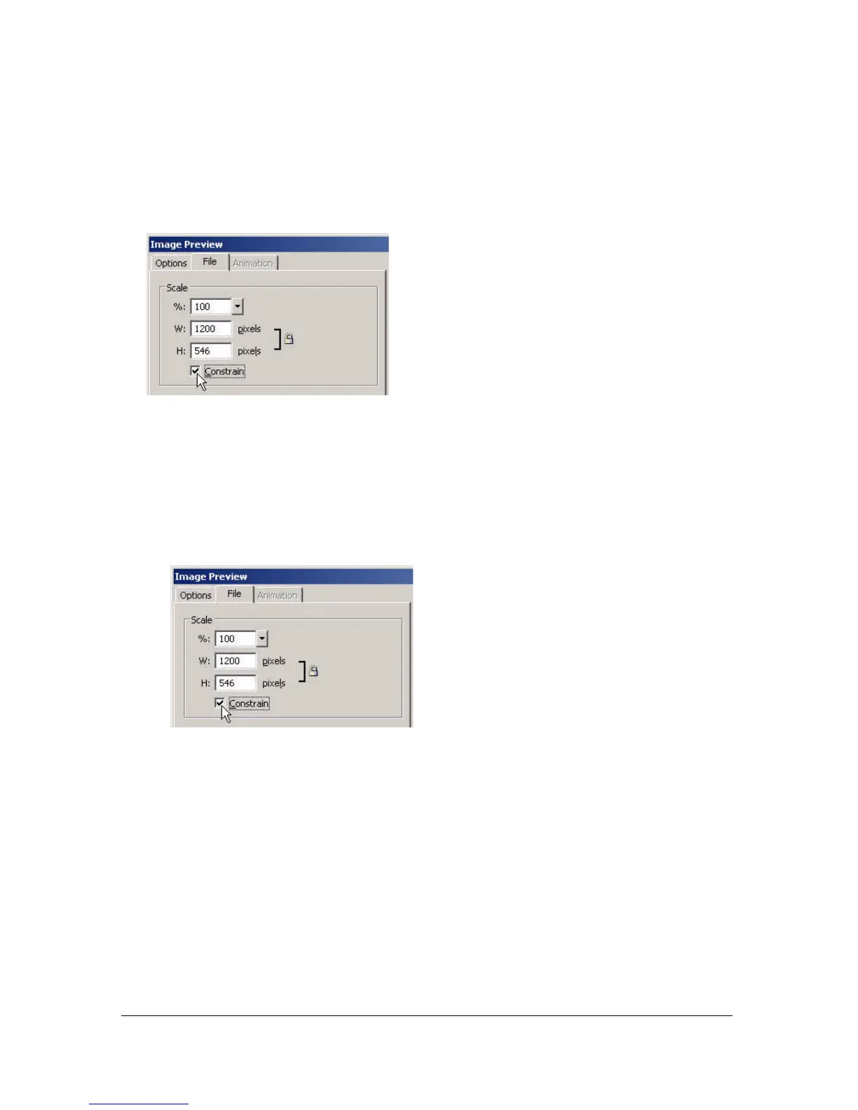2. Specify a scale percentage or enter the desired width and height in pixels. Select Constrain