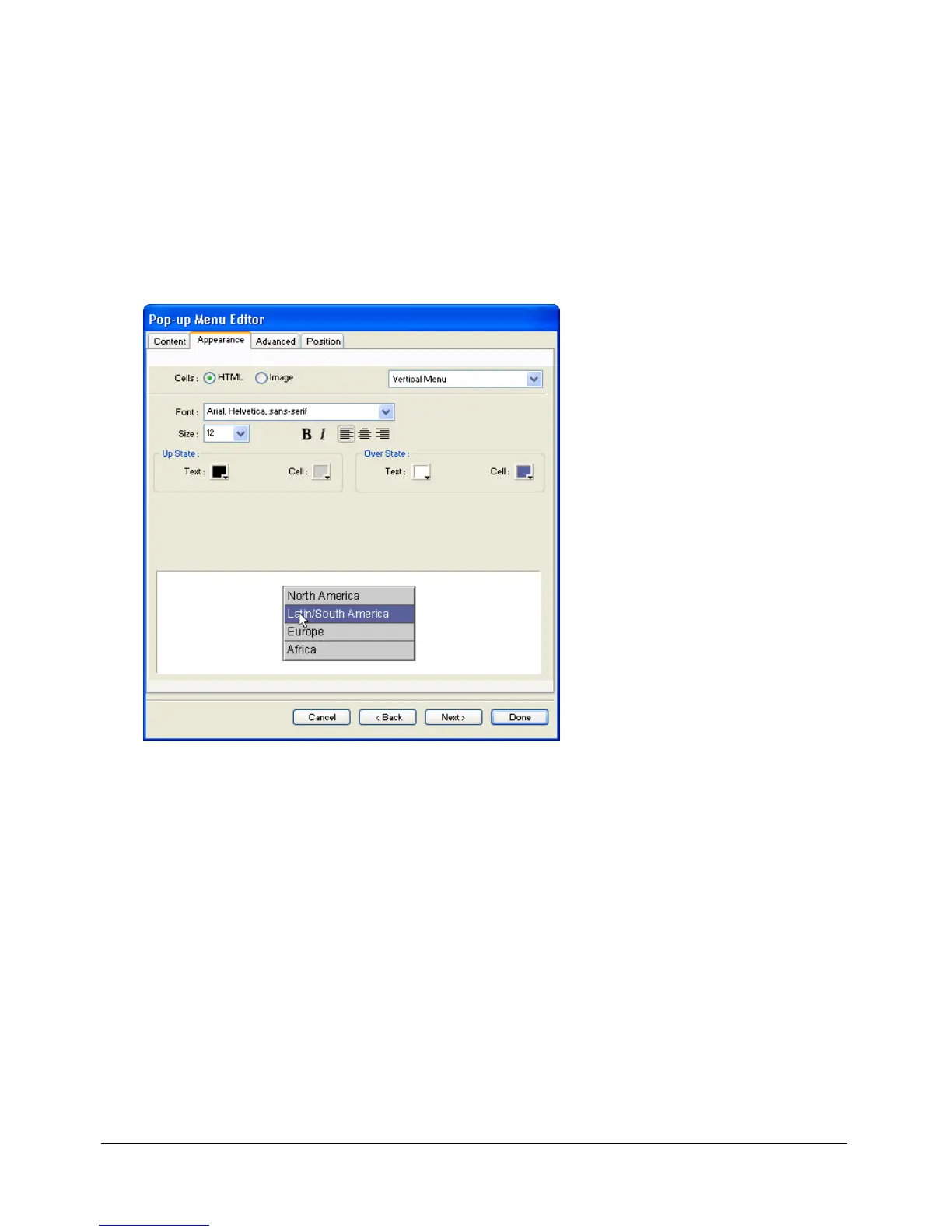 1 With the desired pop-up menu open in the Pop-up Menu Editor, click the Appearance tab.