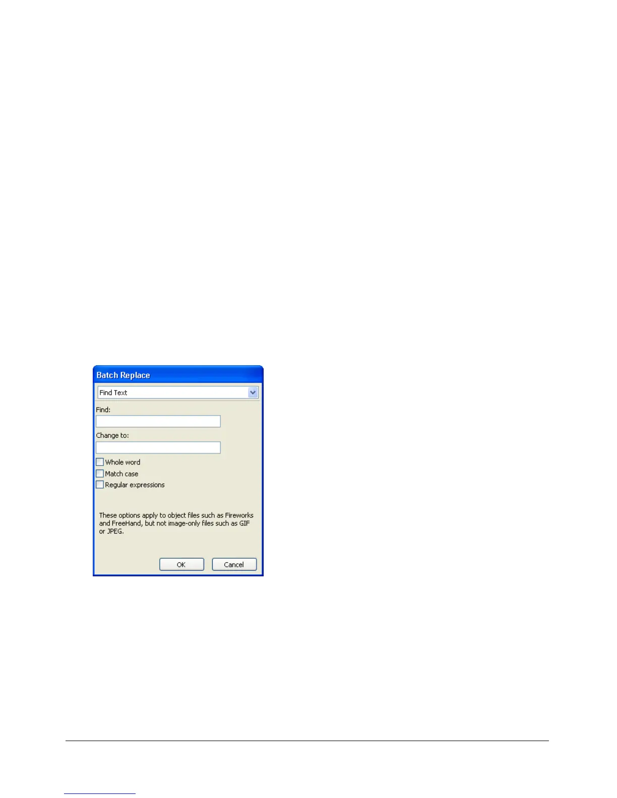 Batch Replace affects only the following file formats: Fireworks PNG, Illustrator, FreeHand, and