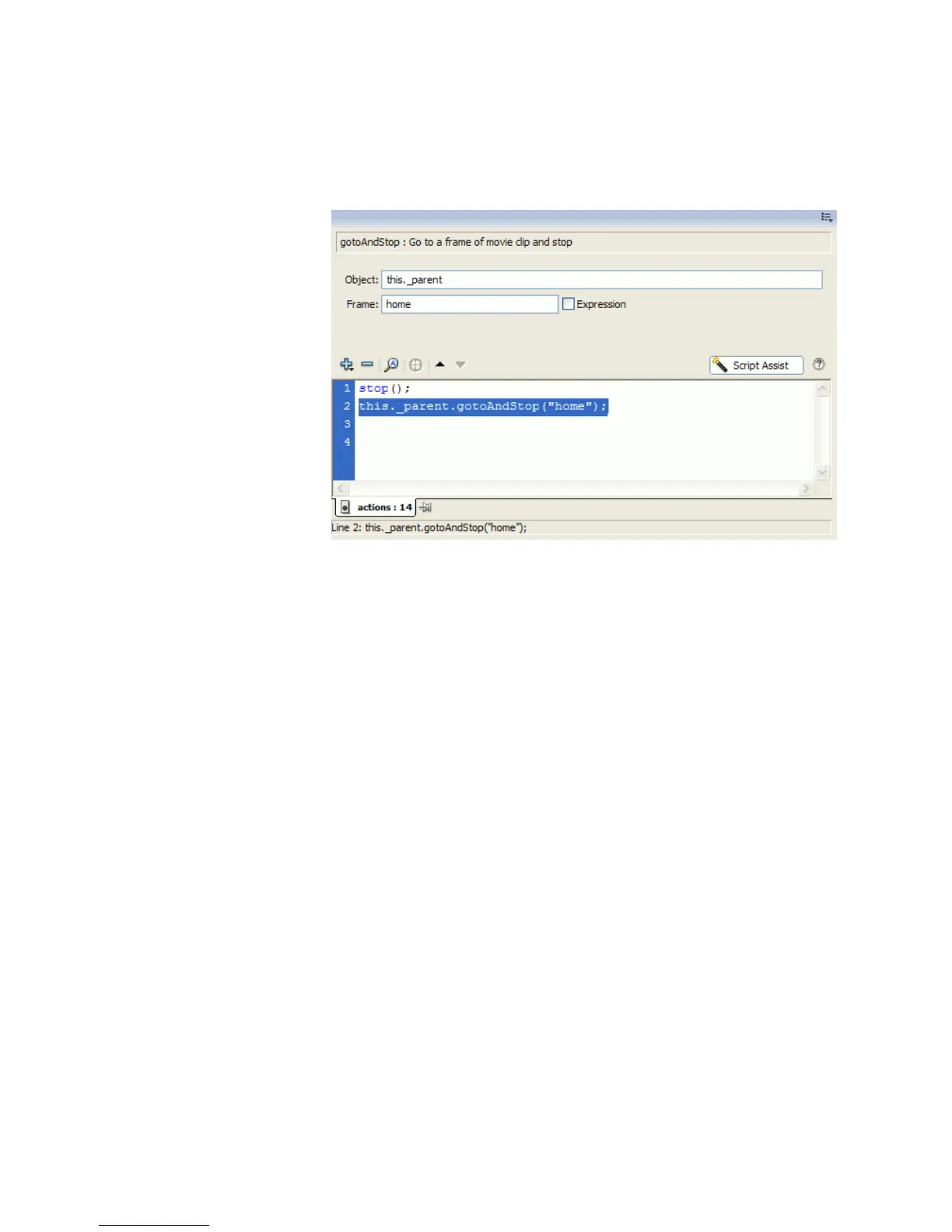 6. In the Script Assist panel, select the gotoAndStop action on line 2.
