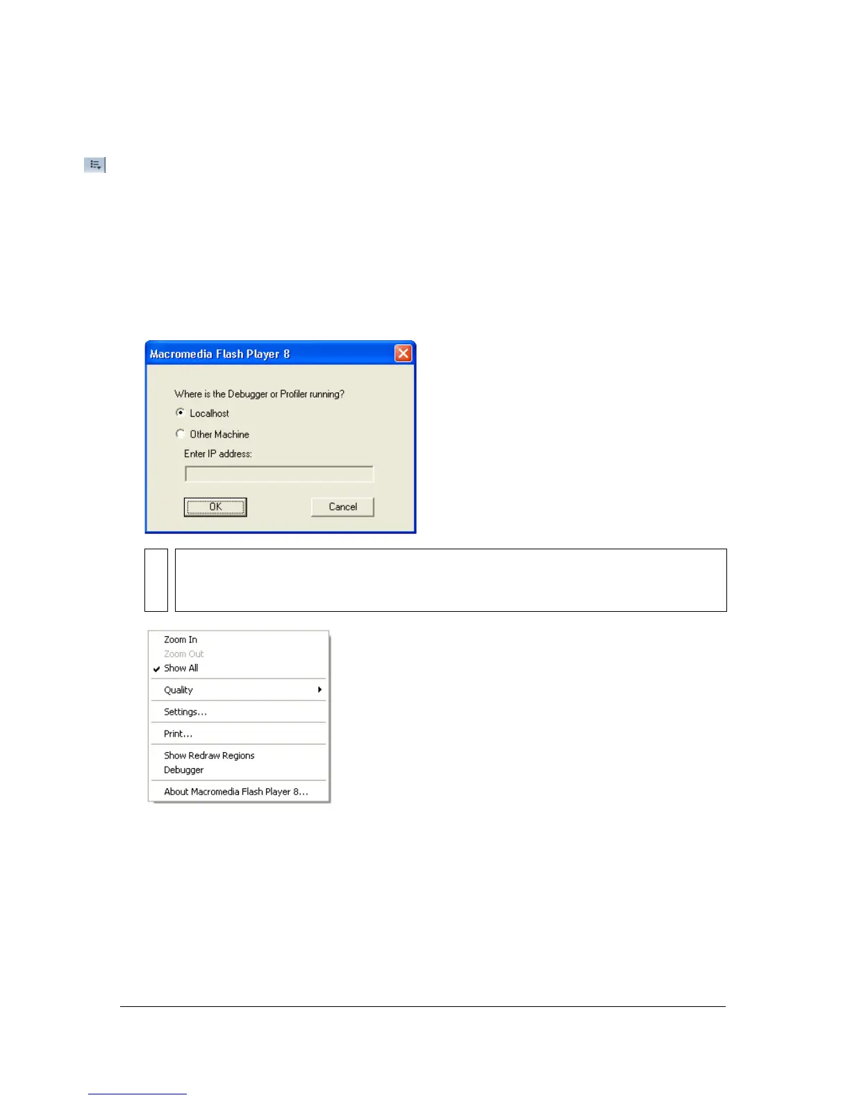 ■ Select Localhost if the Debug player and the Flash authoring application are on the