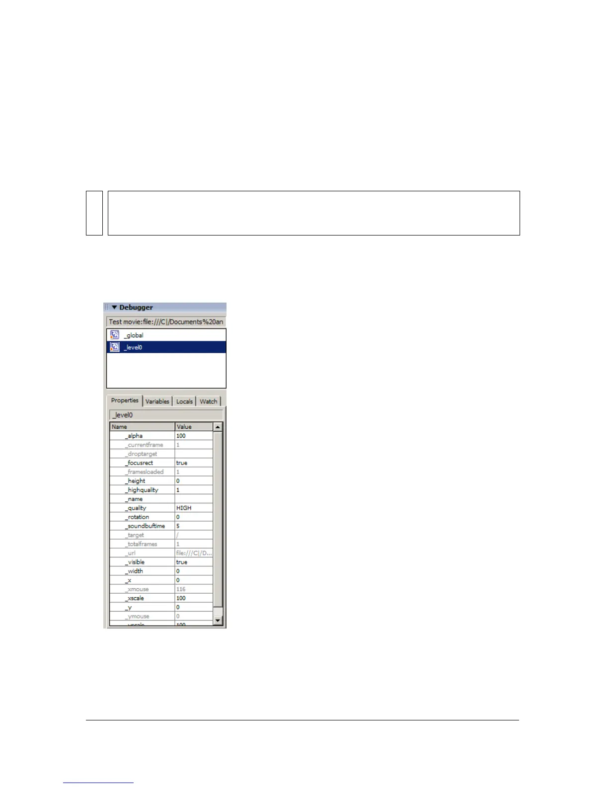 The Debugger’s Properties tab shows all the property values of any movie clip on the Stage.