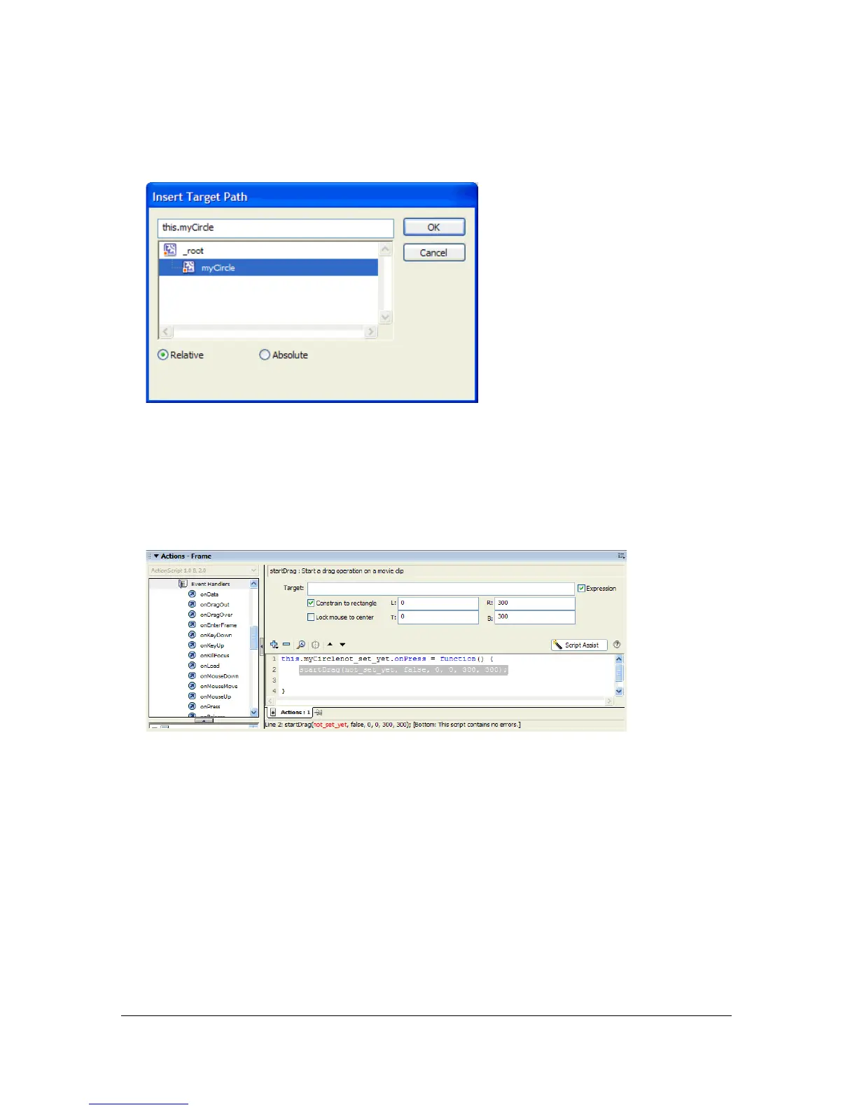 Creating a startDrag/stopDrag event using Script Assist 333