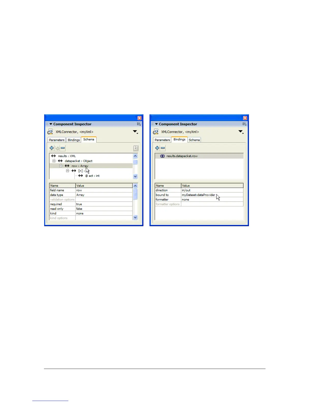 shows an example of using the Component inspector to bind an array of XML nodes,