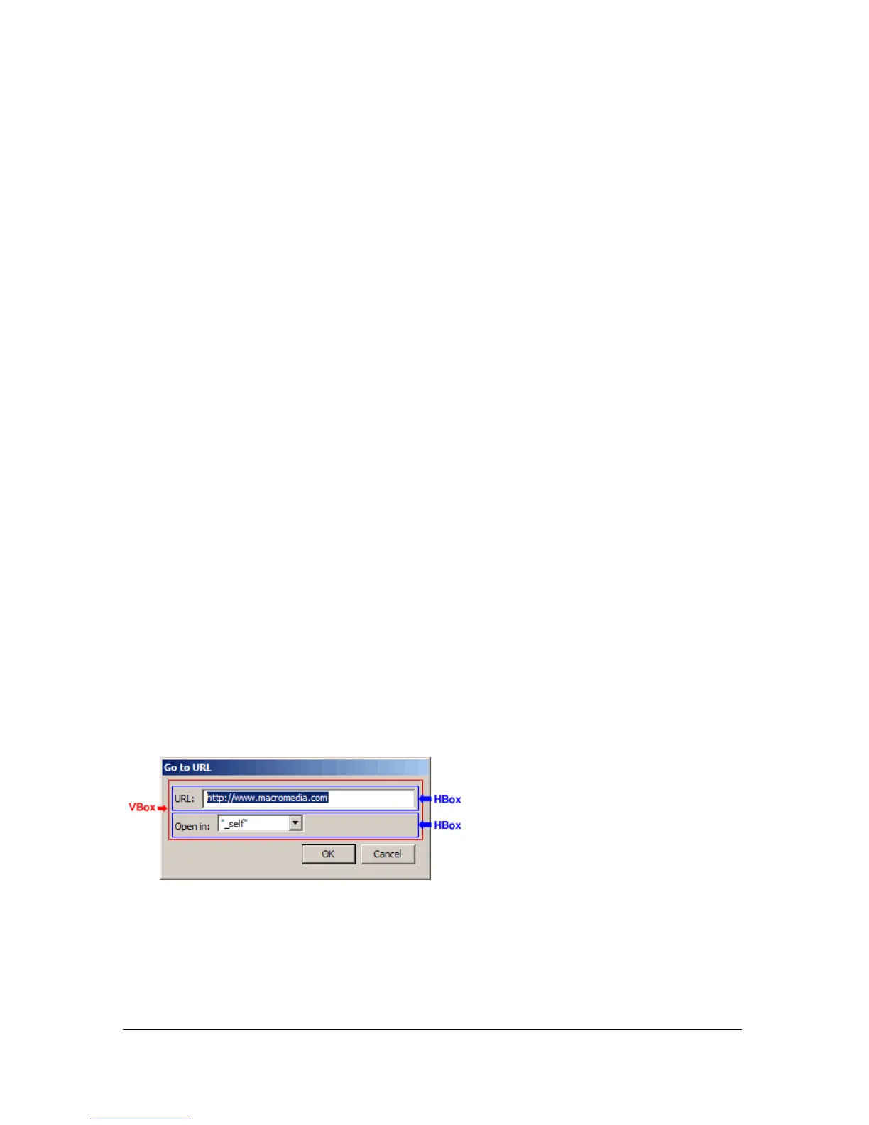 The following graphic shows the Go to URL dialog box. Red and blue outlines of the VBox