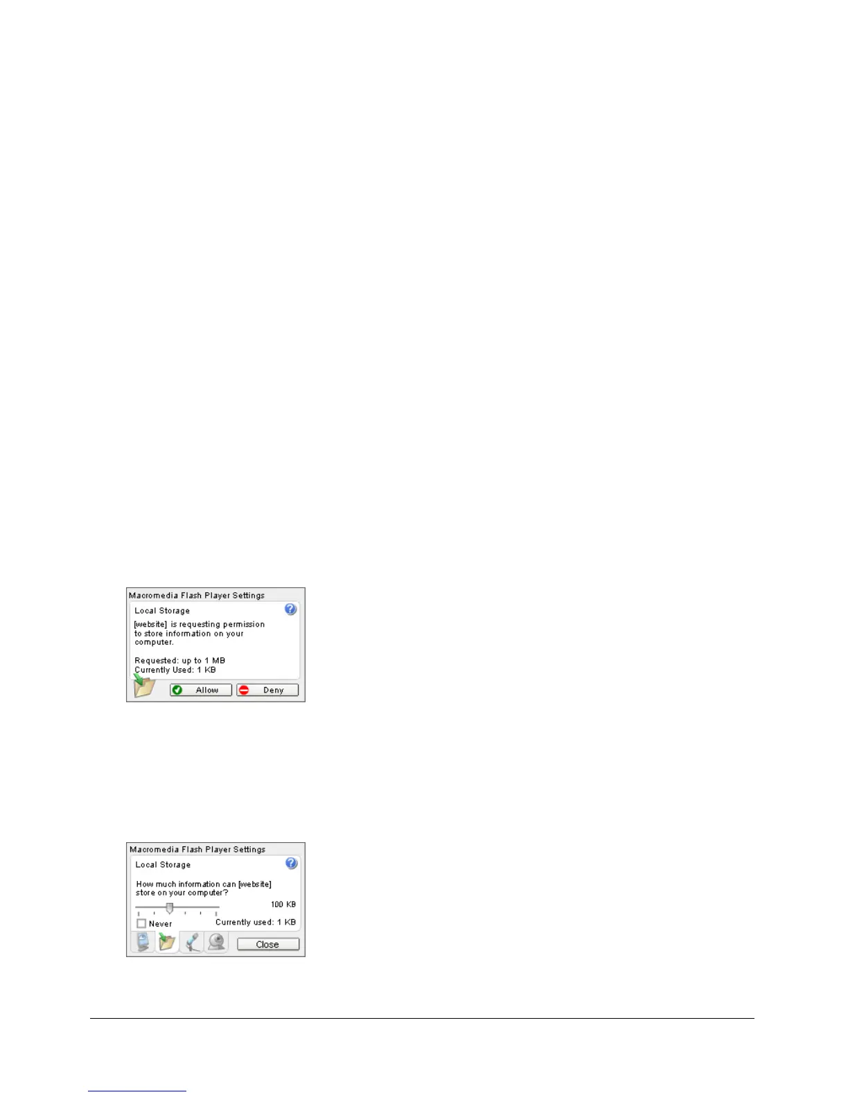 try to save a larger object, Flash Player displays the Local Storage dialog box, which lets the user