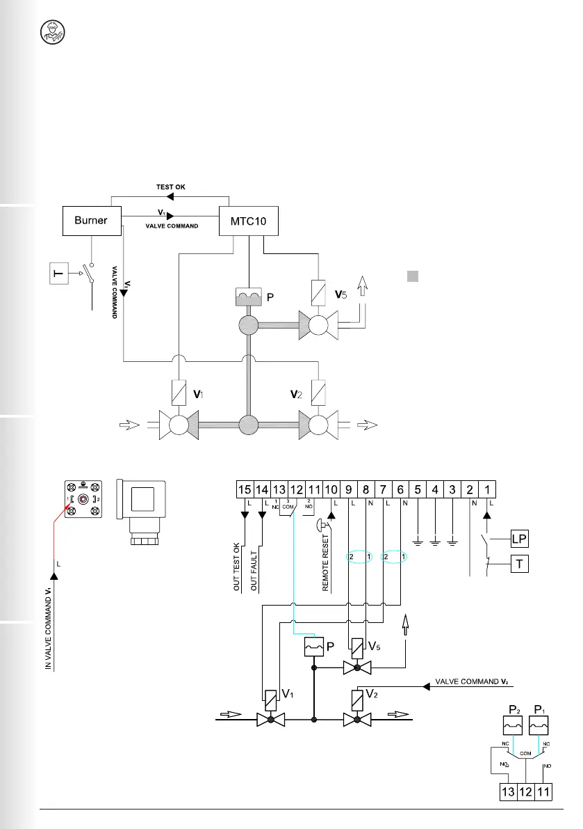 segnale fornito dal Burner Control. Ricevuto il segnale, sul connettore comando valvole, apre V1 (V5 è mantenuta chiusa). Il