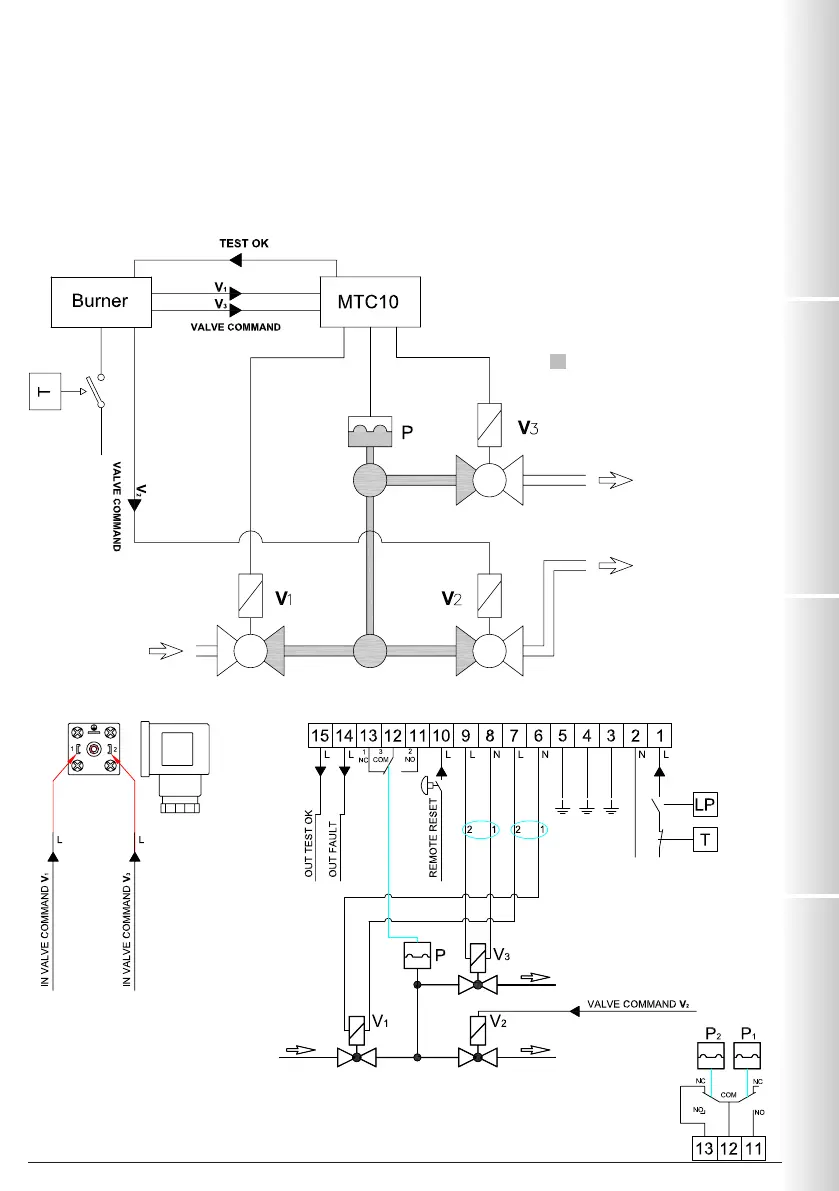 L'MTC10 commande les vannes V1 et V3. Le Burner Control commande la vanne V2.