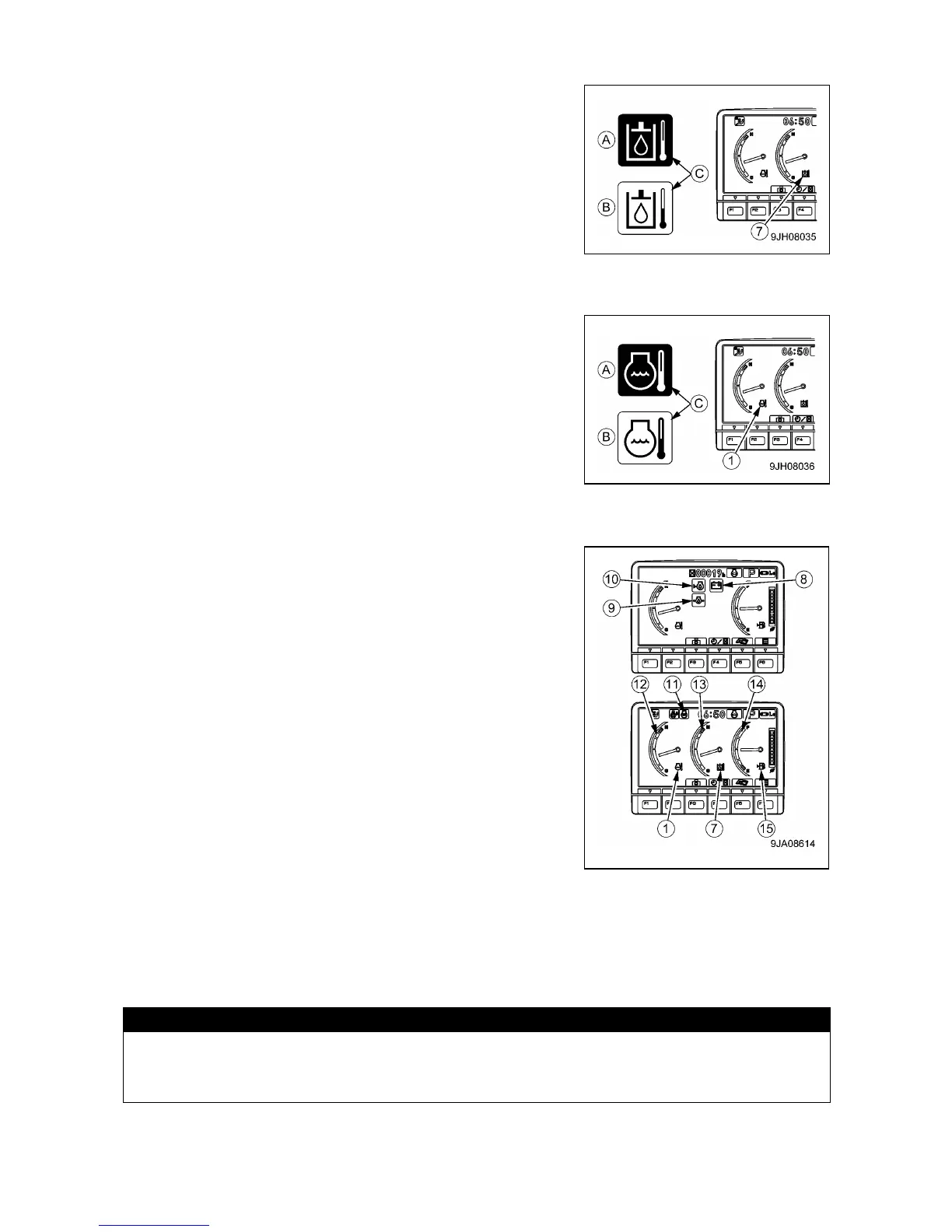 • Hydraulic oil temperature monitor (7): Displays correct