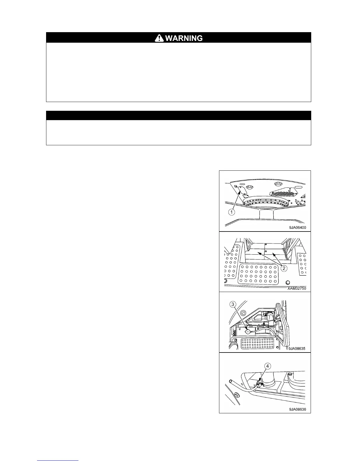 3. Remove 2 covers (2) between the hydraulic tank and operator’s