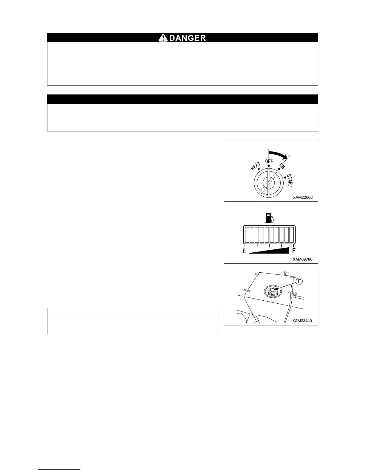 • Be sure to stop the engine when refueling. If refueling was done with the engine in operation,