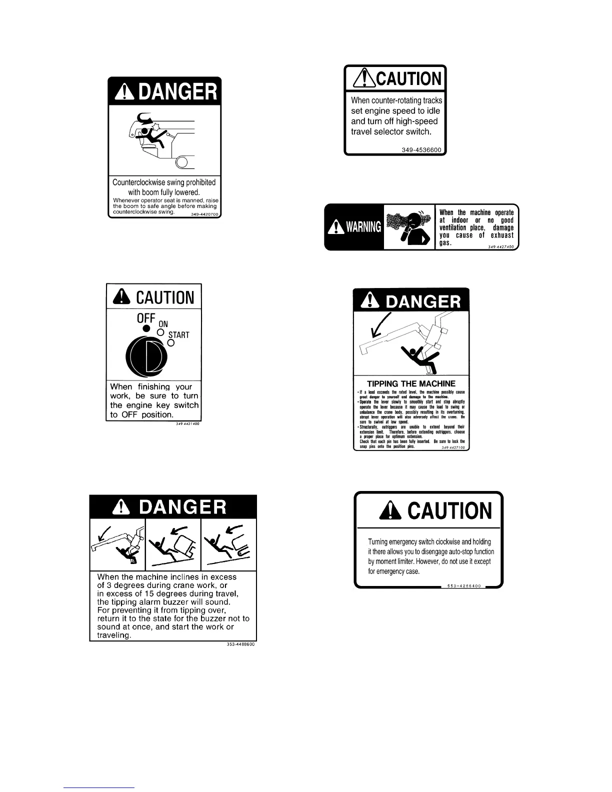 (32) Don't swing counterclockwise when fully lowered (33) Spin turn caution (349-4536600)