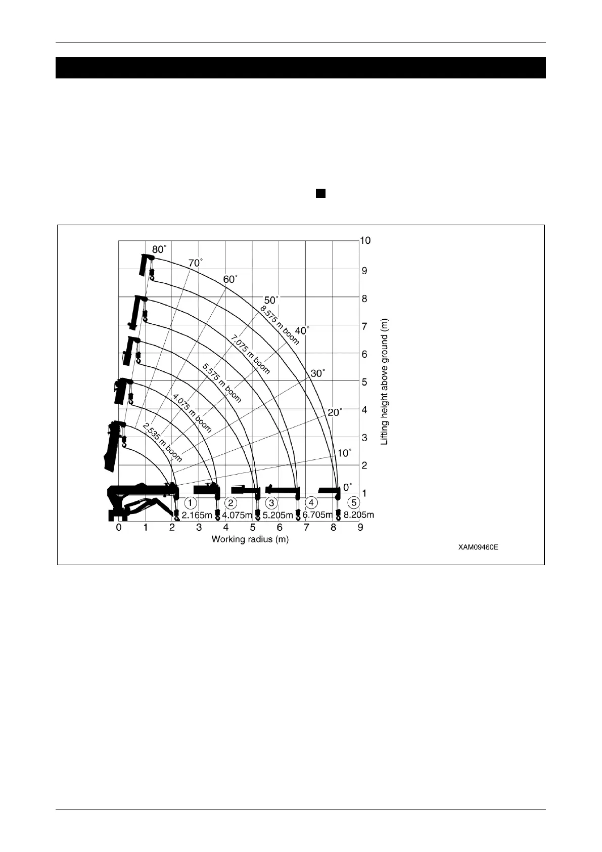 This diagram shows the relationship among the working radius of this machine, boom angle and lifting