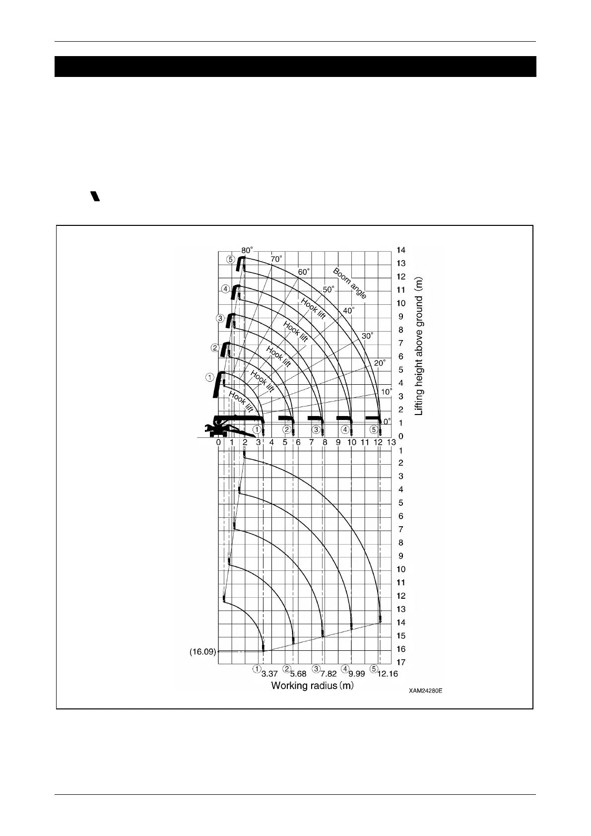 this machine, boom angle, and lifting height above the ground with no object hoisted. The