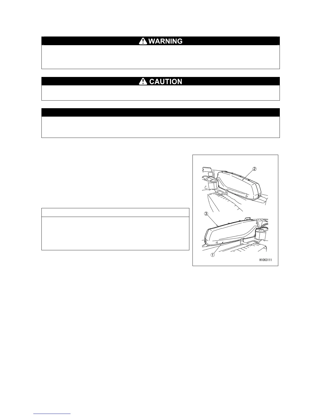• Before removing the machinery cover, be sure to stop the engine and remove the key