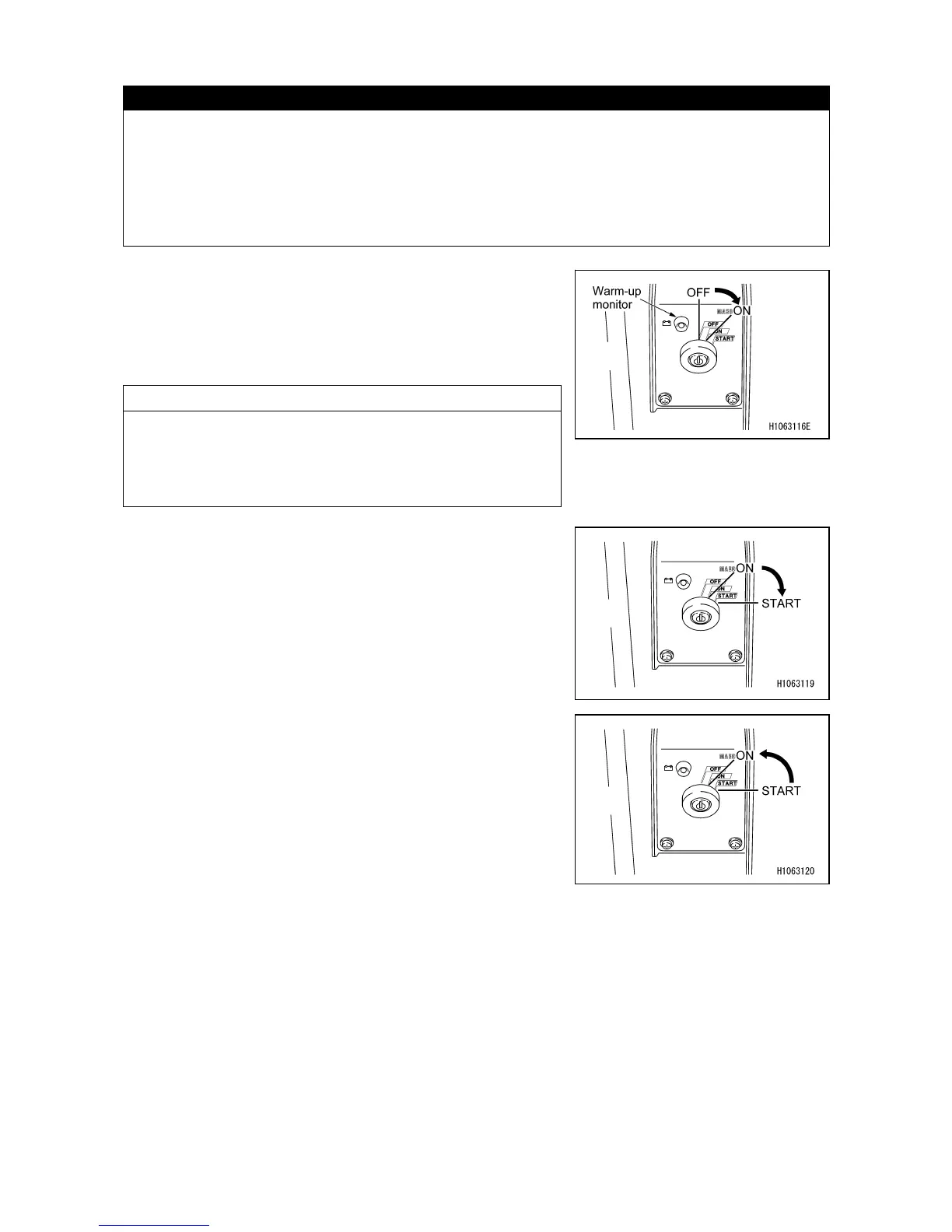 • Do not keep the starter turned for more than 5 seconds. Doing so will accelerate