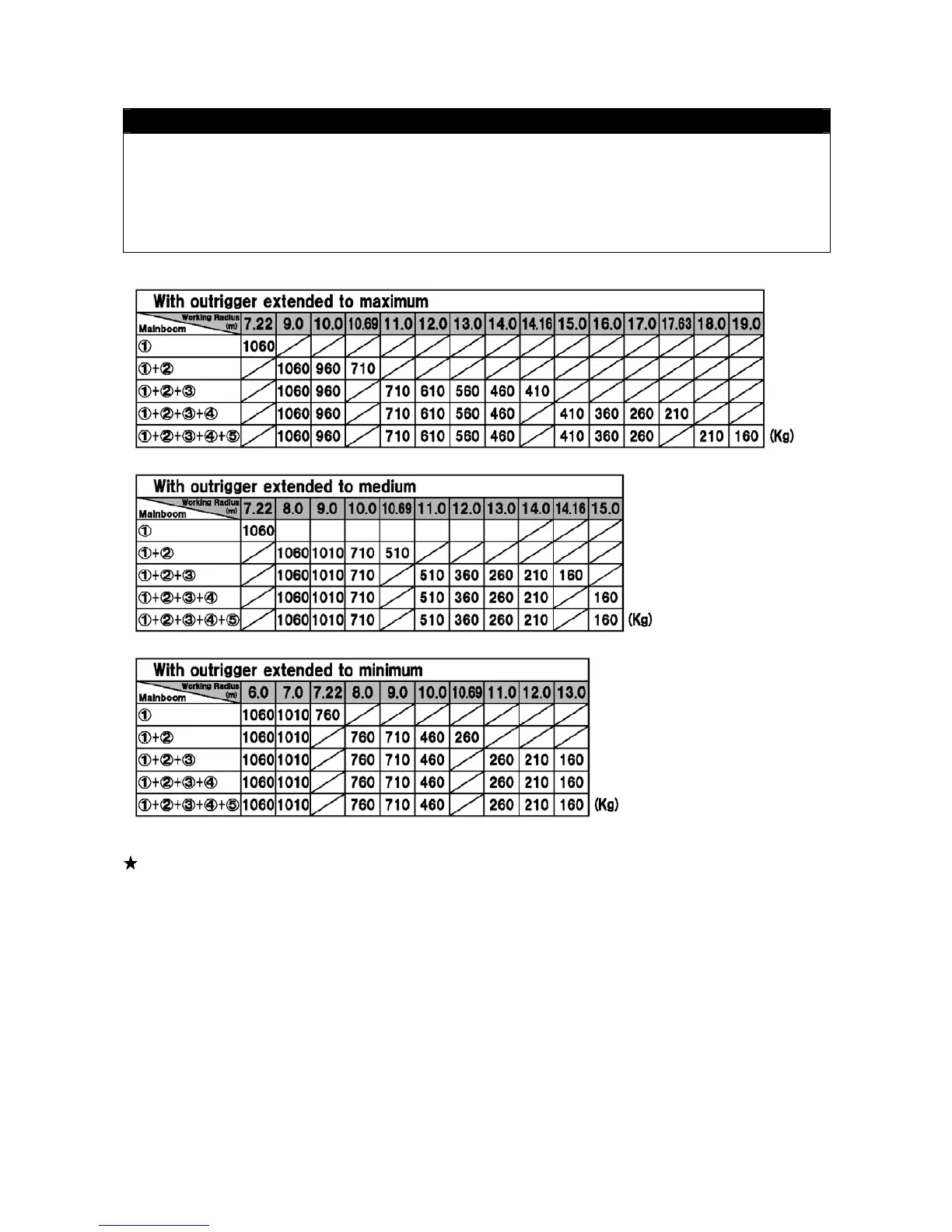 extension, the number of main boom sections, and the working radius. Check the available