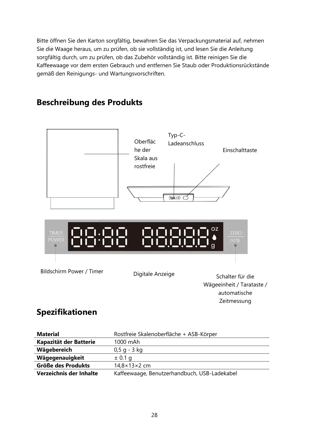 Kaffeewaage vor dem ersten Gebrauch und entfernen Sie Staub oder Produktionsrückstände