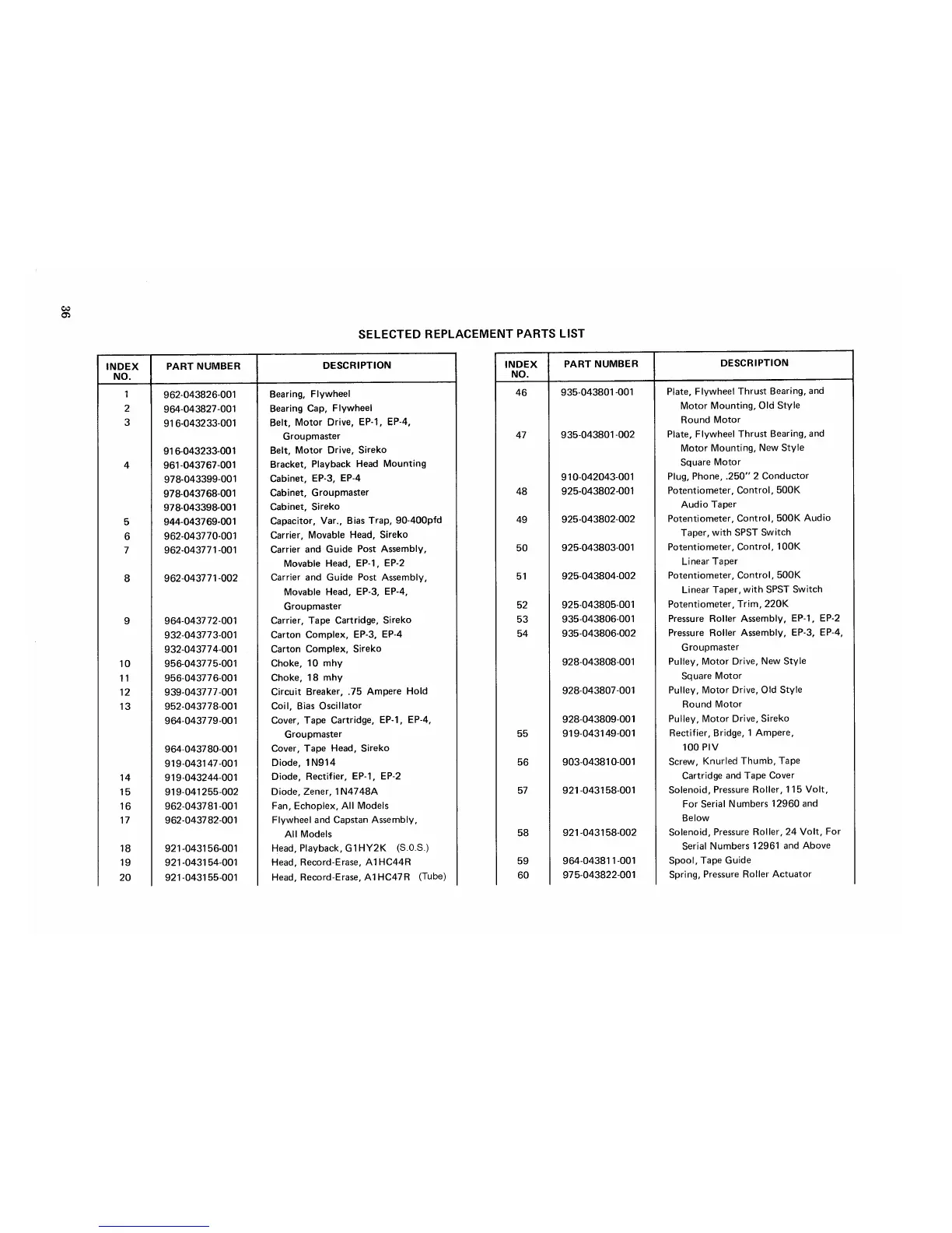 Maestro Echoplex EP-3 - Selected Replacement Parts List