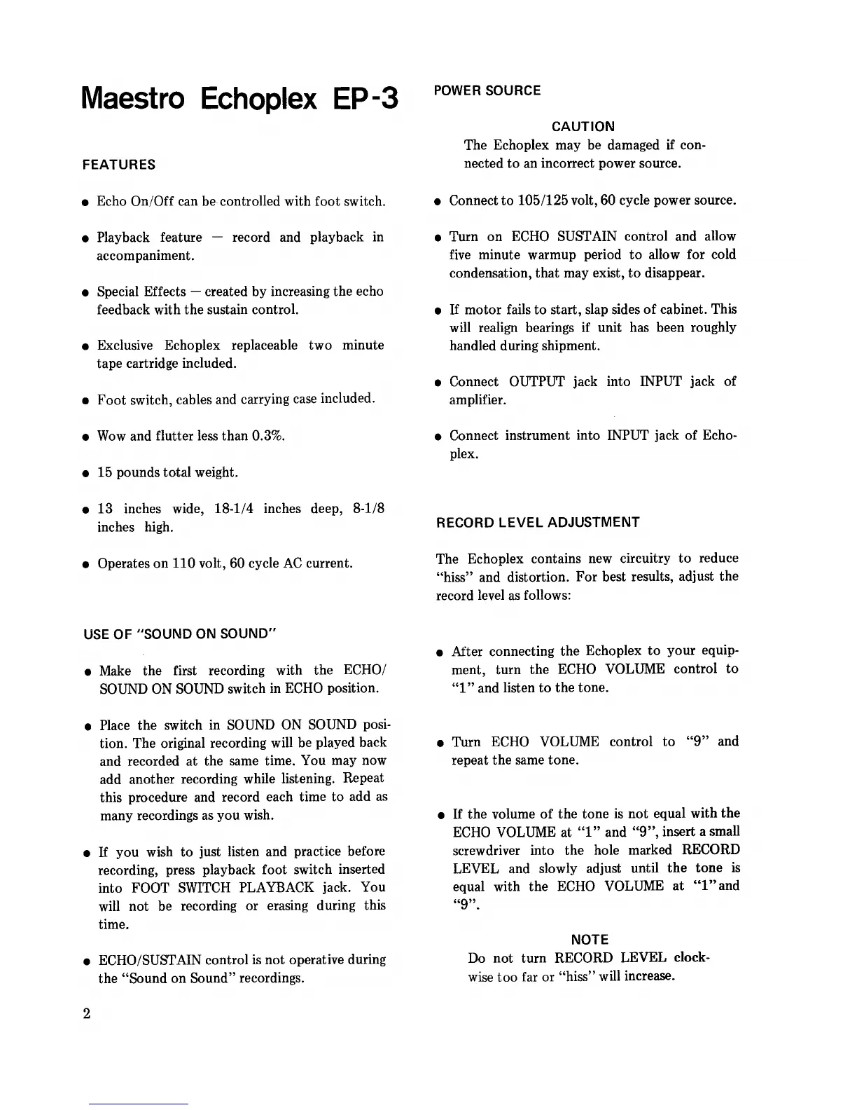 Maestro Echoplex EP-3 - Maestro Echoplex EP-3 Operation and Features; Record Level Adjustment