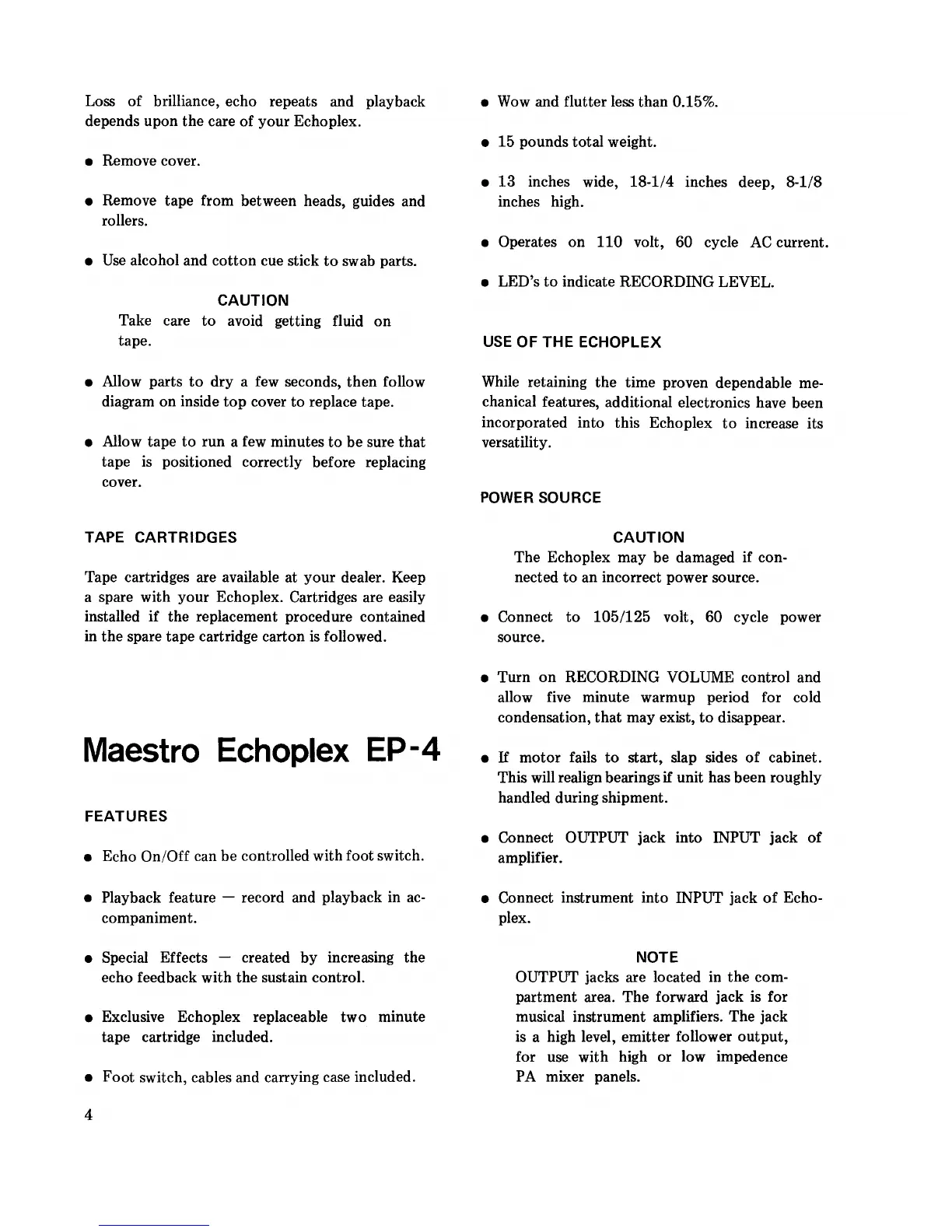 Maestro Echoplex EP-3 - Maestro Echoplex EP-4 Operation and Features; Power Source and Features