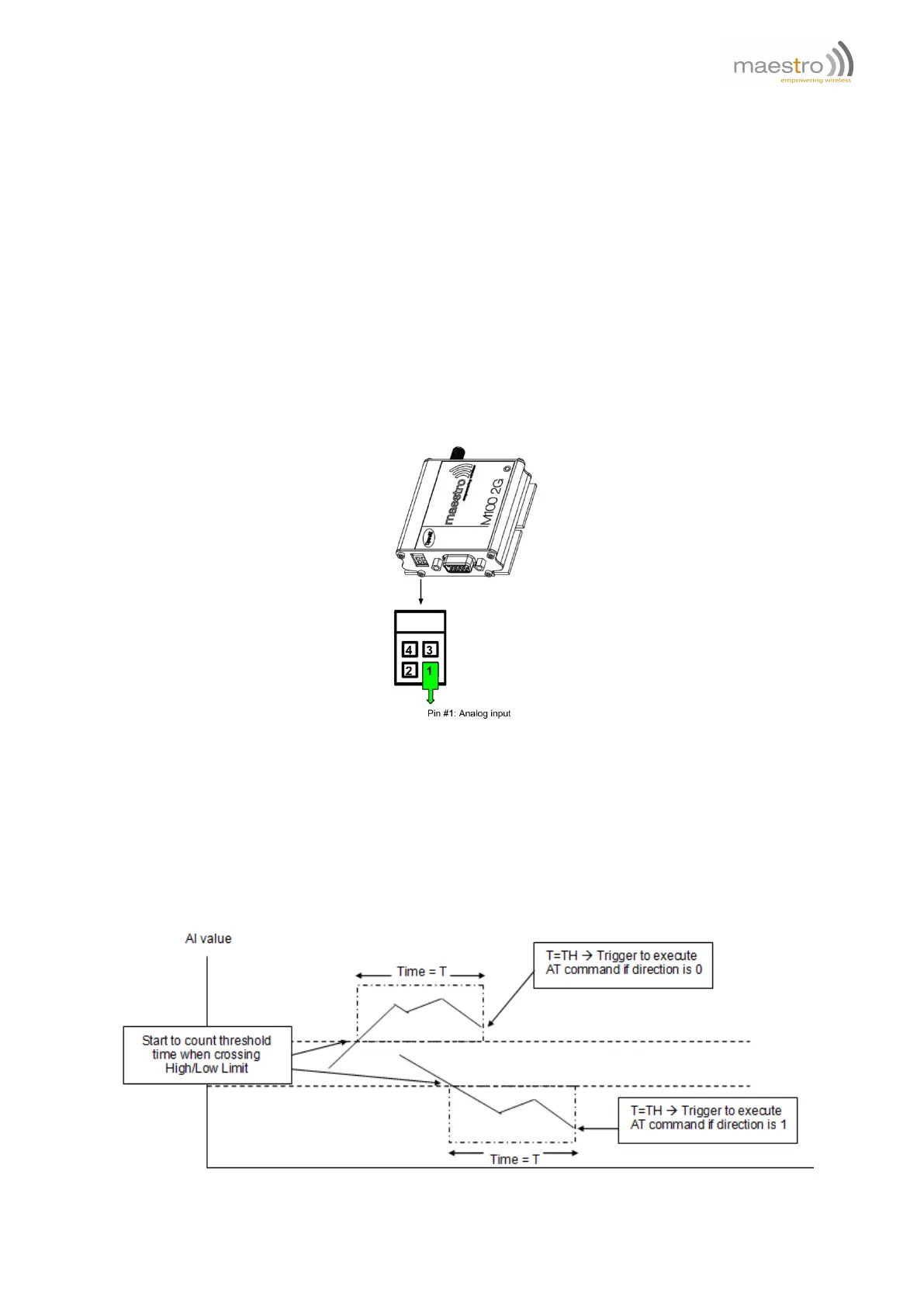This feature uses the Analog Input port as a trigger to execute an AT command when the specified condition is met.