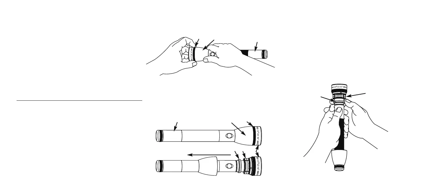 1. Iniziare sbloccando la gonna (A) della torcia elettrica afferrando la canna (B) della