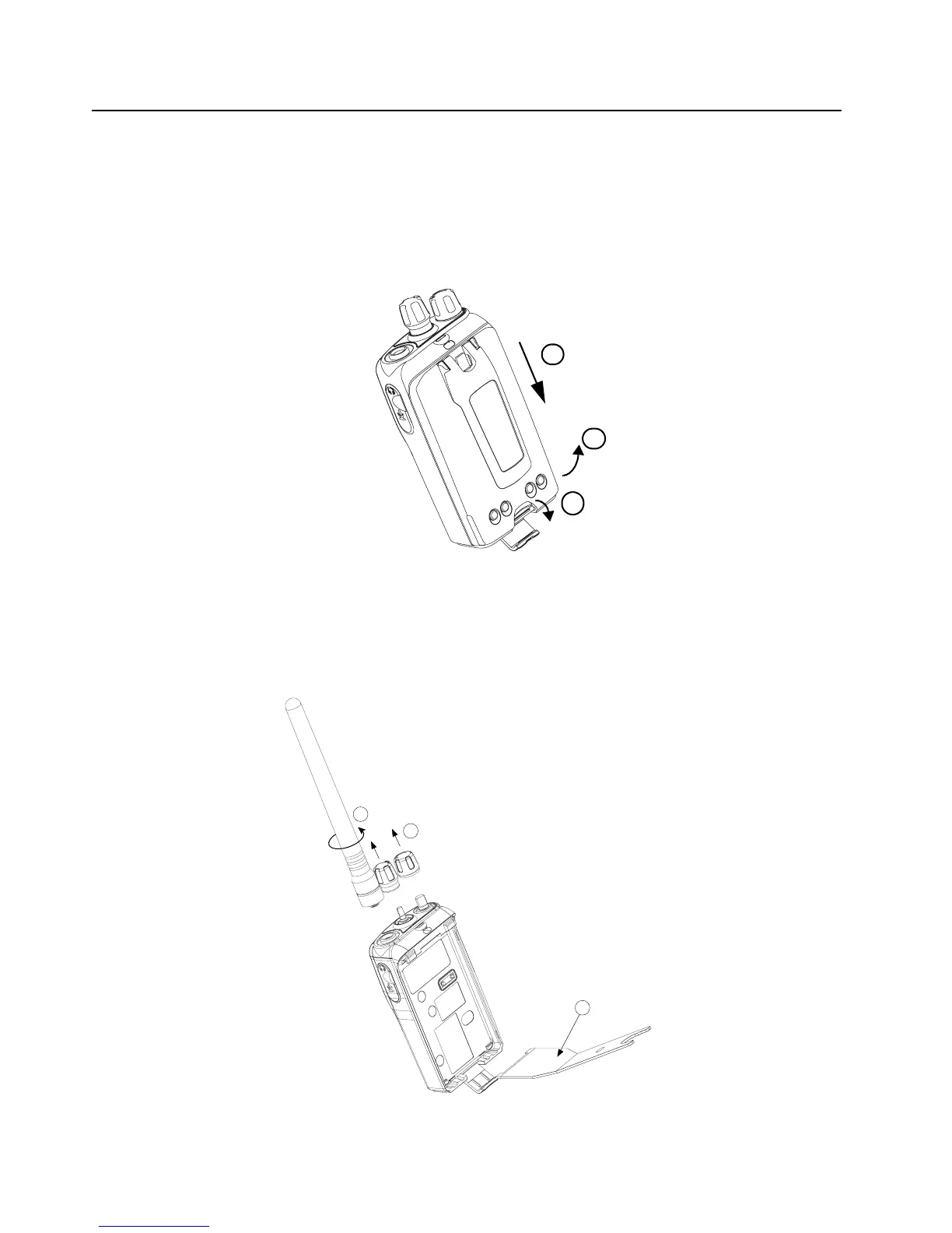 2. Unlatch the battery latch at the bottom of the radio (see “Figure 2-1”). Remove the battery by
