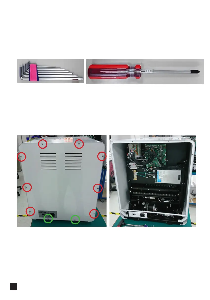 2. Unscrew the 8 screws marked with red circles, loosen the 2 screws marked with