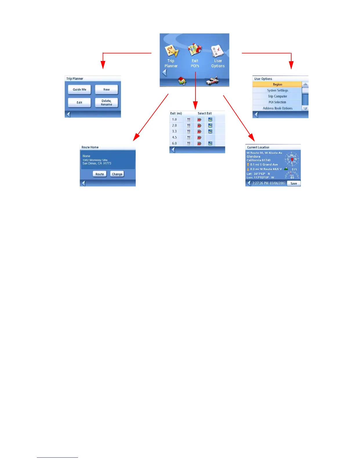 Exit POI’s: (Accessible only while on a freeway.) Provides a listing of restaurants, gas stations, or