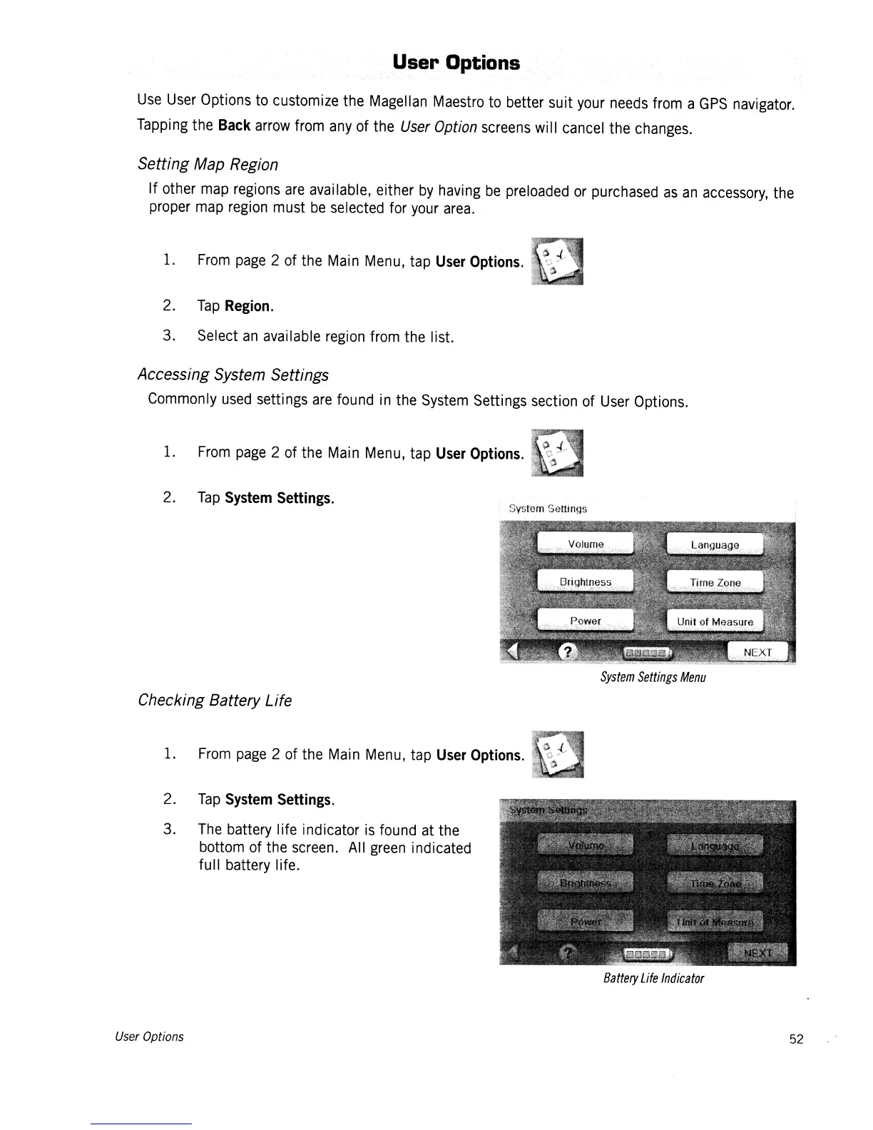 Magellan Maestro 4040 - User Options; Setting Map Region; Accessing System Settings; Checking Battery Life